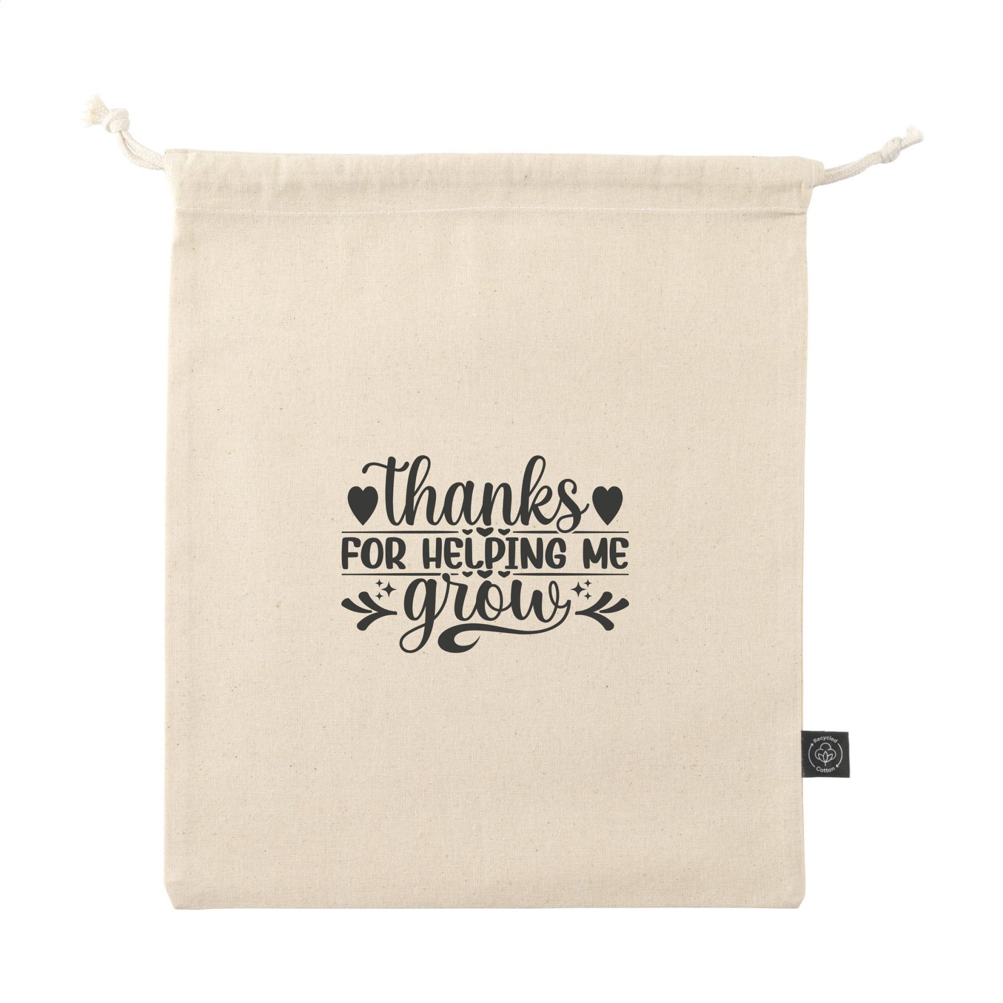 Taaskasutatud puuvillast kinkekott (150 g/m²). Taaskasutatud polüestrist ja taaskasutatud puuvillast valmistatud pingutusnööridega. Originaal kinkepakendiks ja sobib esemete hoiustamiseks. GRS-sertifikaadiga. Kokku taaskasutatud materjal: 95%. Mahutavus ca. 1,5 liitrit.