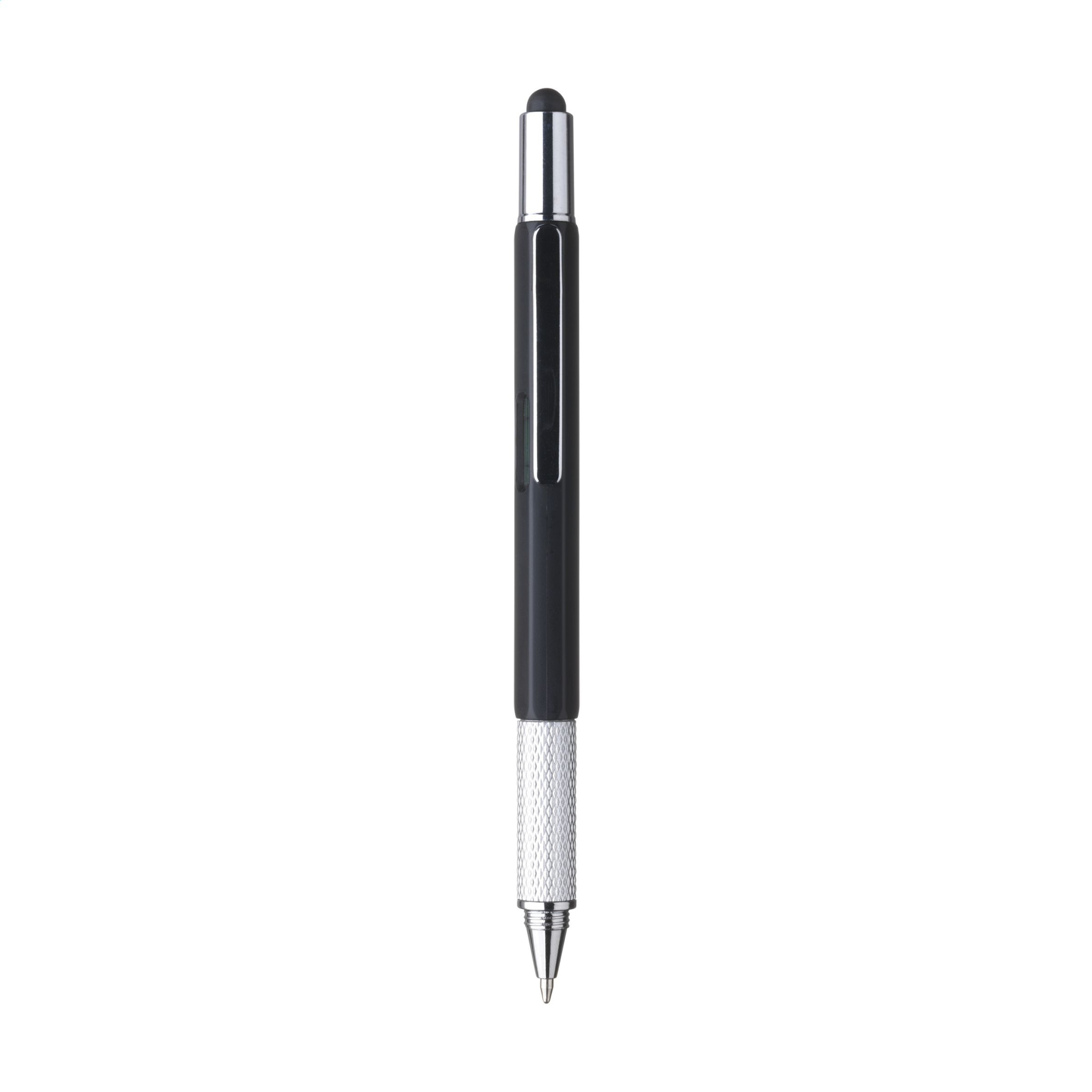 Multifunktsionaalne ABS materjalist pastapliiats. Joonlauaga (7 cm/3 tolli), vesiloodi, kruvikeeraja ja pliiatsi funktsiooniga. Pliiatsil on sinine tint, metallklamber ja keeramismehhanism.