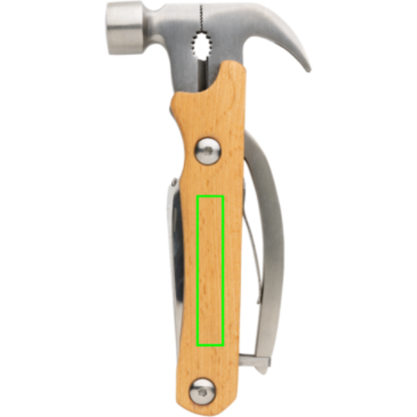 Haamer multitööriist, mis on valmistatud FSC 100% pöögipuidust, kõrge kõvadusega ja korrosioonikindlast roostevabast terasest (420). Rockwelli kõvadus 42-52. Tootel on 10 funktsiooni: tang, nael, küünis, vasar, traadilõikur, viil, kruvikeeraja, pudeliavaja, Philipsi kruvikeeraja, saag, nuga. Tera on toiduohutu. Pakitud FSC mix kraft karpi.