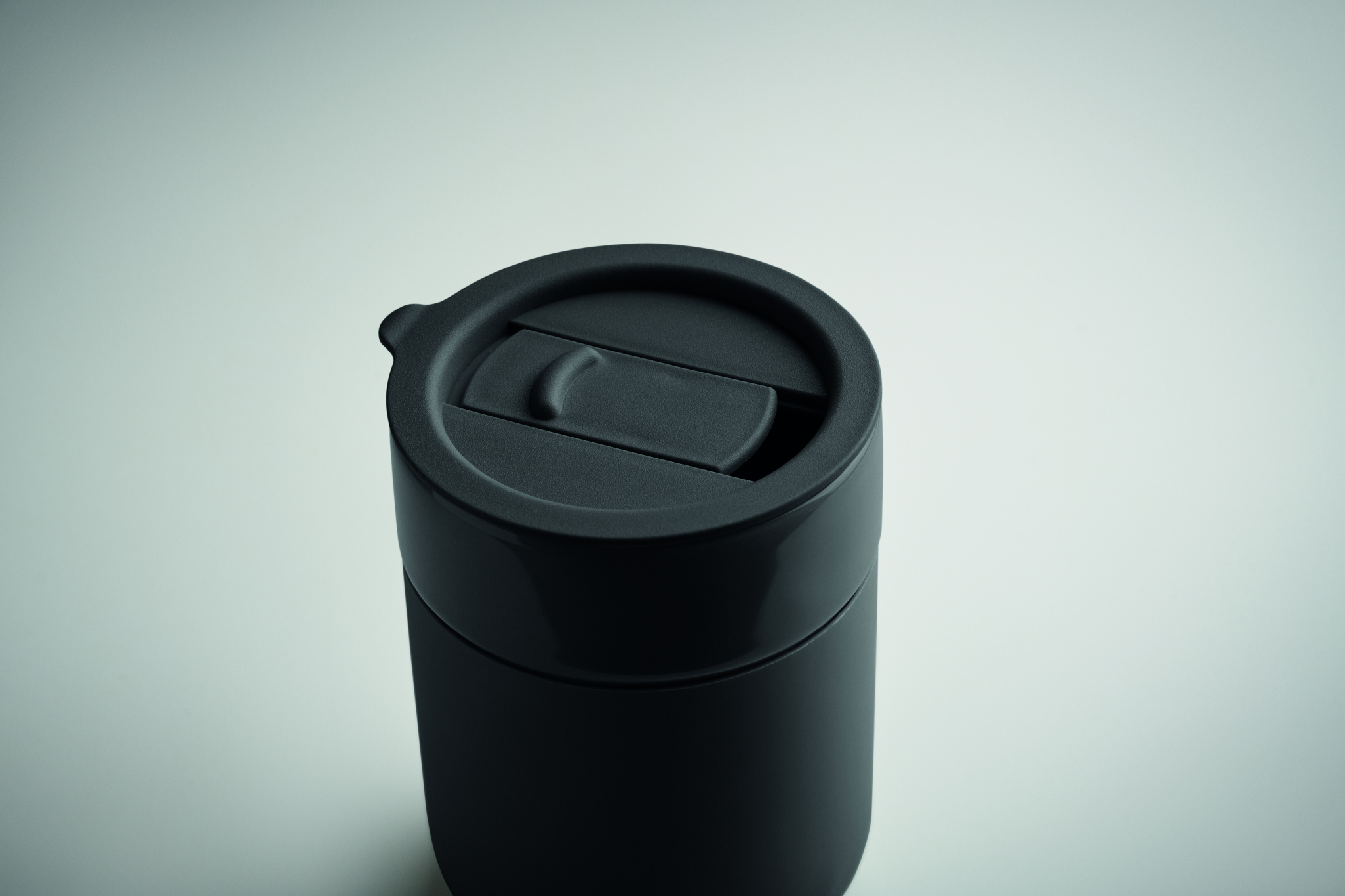 Must keraamiline termoskruus silikoonist detailiga ja PP kaanega. Mahutavus: 330 ml.