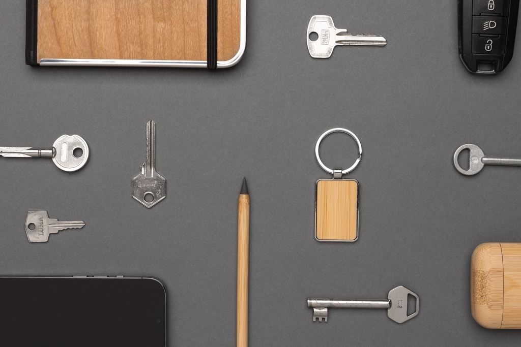 Logotrade firmakingi foto: RCS taaskasutatud tsingisulamist ristkülikukujuline bambusega võtmehoidja