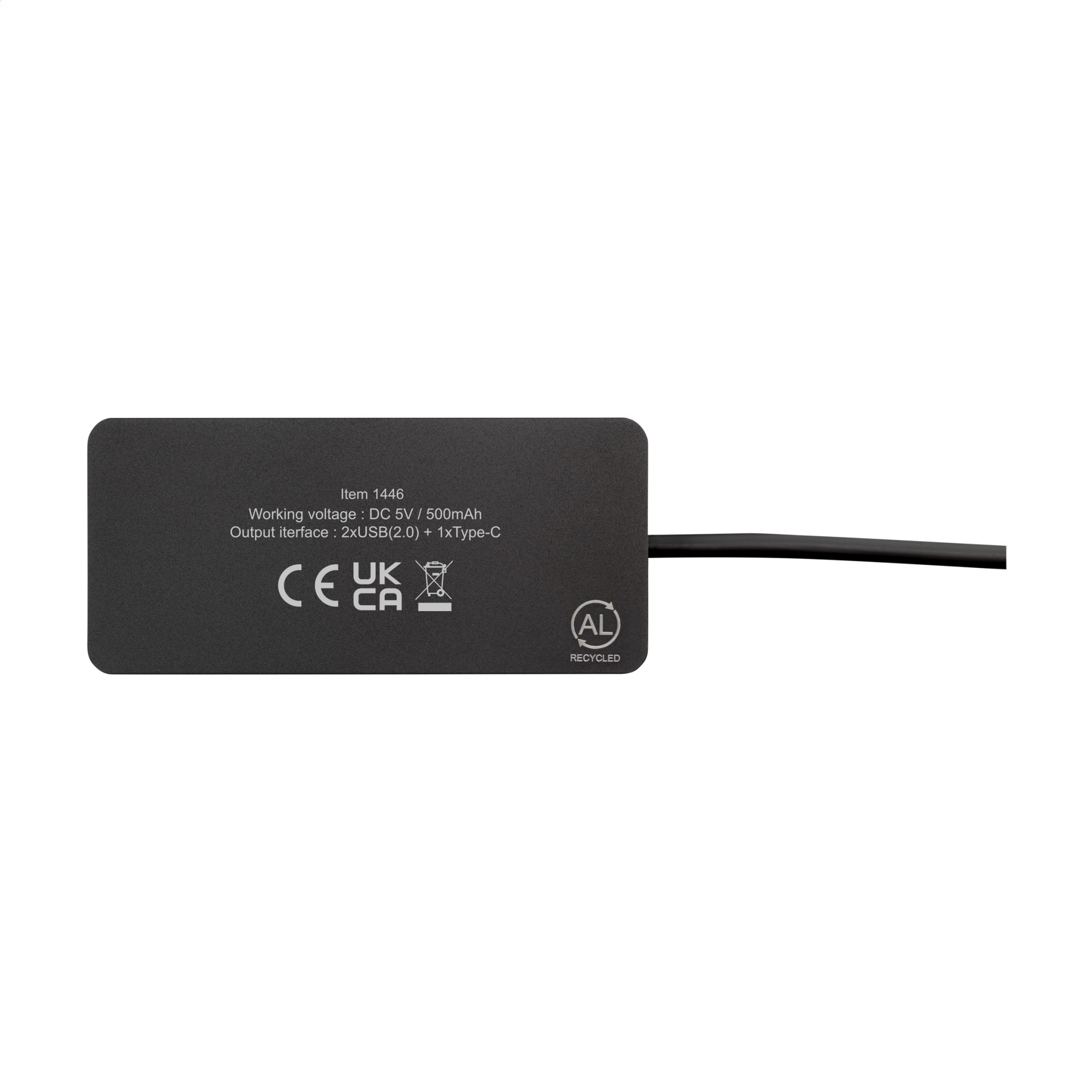 Kompaktne ja kerge 2.0 USB-jaotur. Korpus on valmistatud 100% GRS-sertifikaadiga taaskasutatud alumiiniumist. Varustatud 3 USB-pordiga: 1 USB-A 2.0 port ja 2 Type-C porti lisaseadmete ühendamiseks. Kaasas sobiv must kaabel kahe sisendiga, mis sobib nii c-tüüpi kui ka USB-A arvutitele. Kokku taaskasutatud materjal: 50%. Kasutades taaskasutatud alumiiniumi, kasutatakse selle toote valmistamisel vähem uusi tooraineid. See tähendab väiksemat energiatarbimist ja vähem veekasutust. Vastutustundlik valik. Iga ese on eraldi karbis.