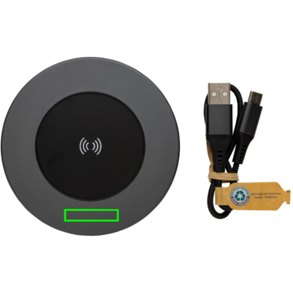 Alumiiniumist 10 W juhtmevaba kiirlaadija, mis on valmistatud RCS (Recycled Claim Standard) sertifitseeritud taaskasutatud alumiiniumist, ABS-ist ja TPE-st. Taaskasutatud kogusisaldus: 75% eseme kogukaalust. RCS-sertifikaat tagab taaskasutatud materjalide täielikult sertifitseeritud tarneahela. Alumiinium ei kaota ringlussevõtu käigus oma omadusi ja seda saab ringlusse võtta lõputult. Sisaldab 120 cm C-tüüpi laadimiskaablit, mis on valmistatud RCS-sertifikaadiga taaskasutatud alumiiniumist, TPE-st ja PET-st. Pakitud FSC® segupakendisse. Sisend 9V/2A Väljund: 9V/1,1A.