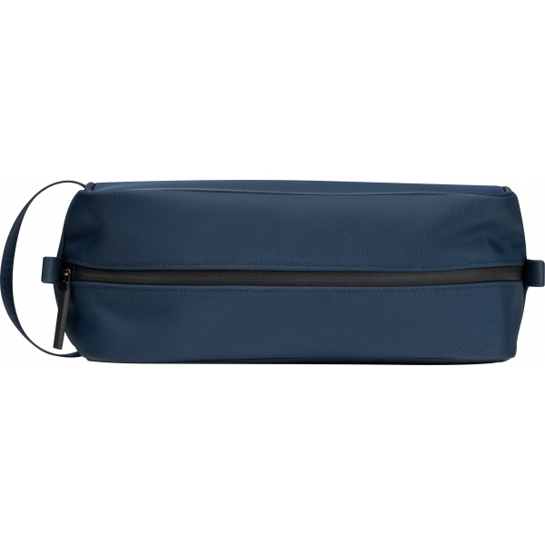 PU-st valmistatud kosmeetikakott lukuga suletava ja kahe riputussangaga.