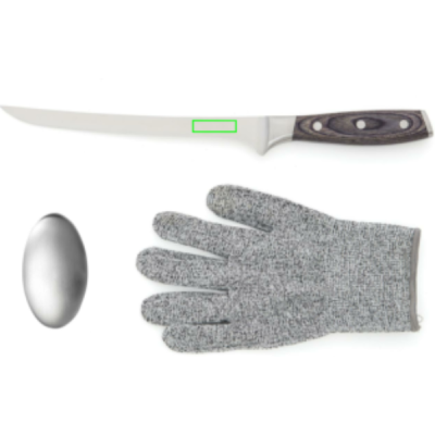 Kalafileerimiskomplekt, mis koosneb fileerimisnoast, terasvõrgust kindast ja metallseebist. Kinnas annab kalale täiendava haarde ja kaitseb teid äparduste eest. Metallseep eemaldab lõhnad, nagu kala ja sibul, mida teistel seepidel on raske nihutada. Nuga on valmistatud X50CrMoV15 Saksa terasest, Pakkawood käepidemega. Kergesti haaratav käepide ja tera suurepärane tasakaal muudavad noaga töötamise mugavaks ja lihtsaks. Mõõdud: 21 cm tera.