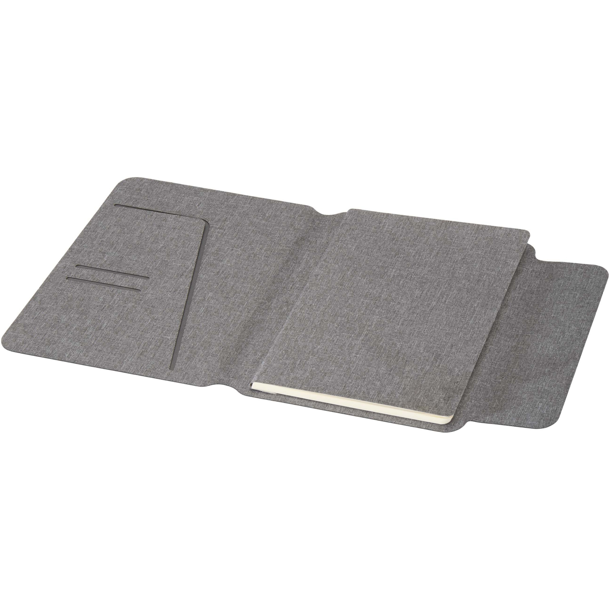 A5-kokoinen Andean-portfolio on valmistettu osittain RCS-sertifioidusta kierrätetystä polyesteristä, mikä tarjoaa kestävämmän vaihtoehdon vähentämällä kokonaan uusien materiaalien käyttöä. Tyylikkäissä, harmaissa, kovissa kansissa on pyöristetyt kulmat, ja ne on tehty tarkkuushitsaustekniikalla. Portfolio kiinnitetään magneettisella sulkimella, jota korostava hienostunut, pähkinäpuinen yksityiskohta lisää modernia ja hienostunutta ilmettä. Sisäpuolella on irrotettava pehmeäkantinen muistikirja, jossa on 64 kermanväristä, viivoitettua arkkia. Muistikirja on valmistettu vastuullisesti hankitusta 80 g/m²:n paperista. Toimitetaan voimapaperin värisessä paperitaskussa.
