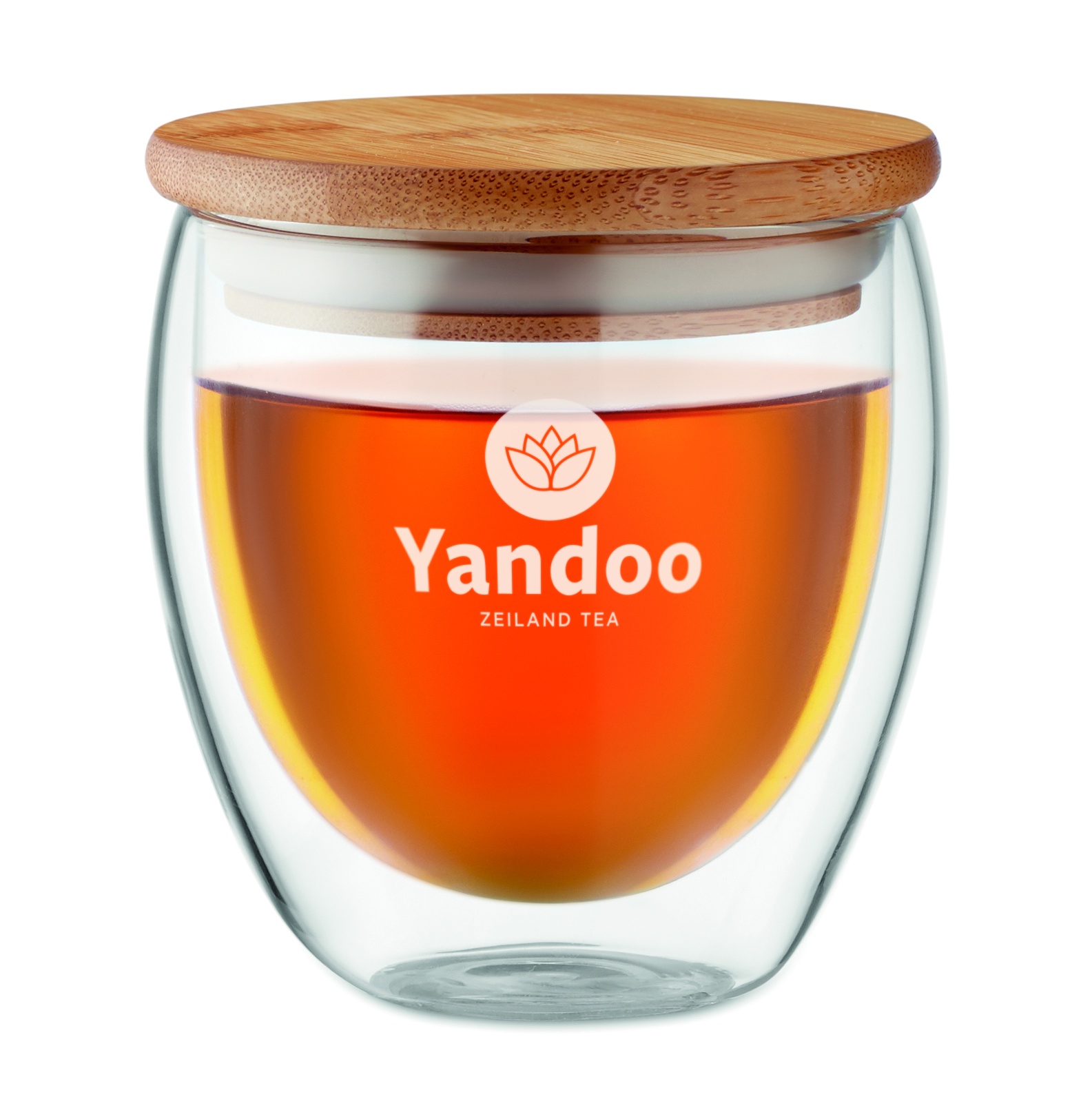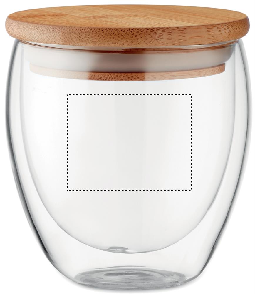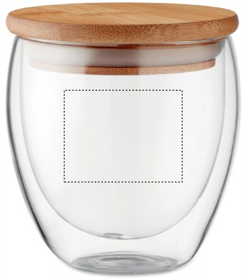 Kaksiseinäinen 250 ml borosilikaattilasi bambukannella, kannessa silikonirengas. Luonnollisen materiaalin (bambu) vuoksi, tuotteiden värissä/ koossa saattaa olla erinäisyyksiä ja tämä voi vaikuttaa painatuksen lopputulokseen.