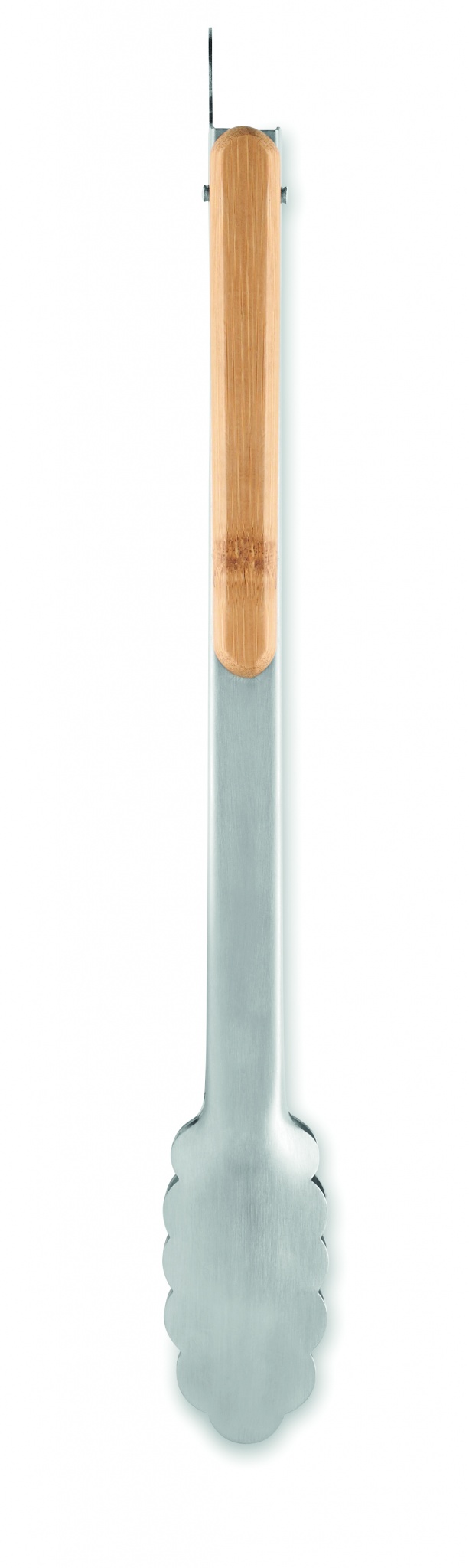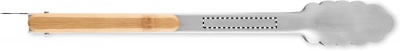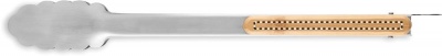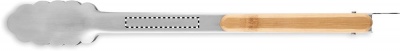 Ruostumattomasta teräksestä valmistetut grillipihdit bambukahvoilla. Lukitusmekanismi.