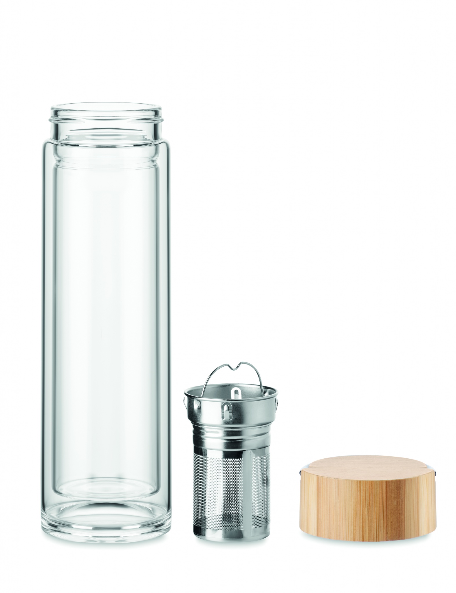 Kaksiseinäinen borosilikaattilasista valmistettu pullo, jossa on bambukansi ja teesihvilä. Tilavuus 400 ml.