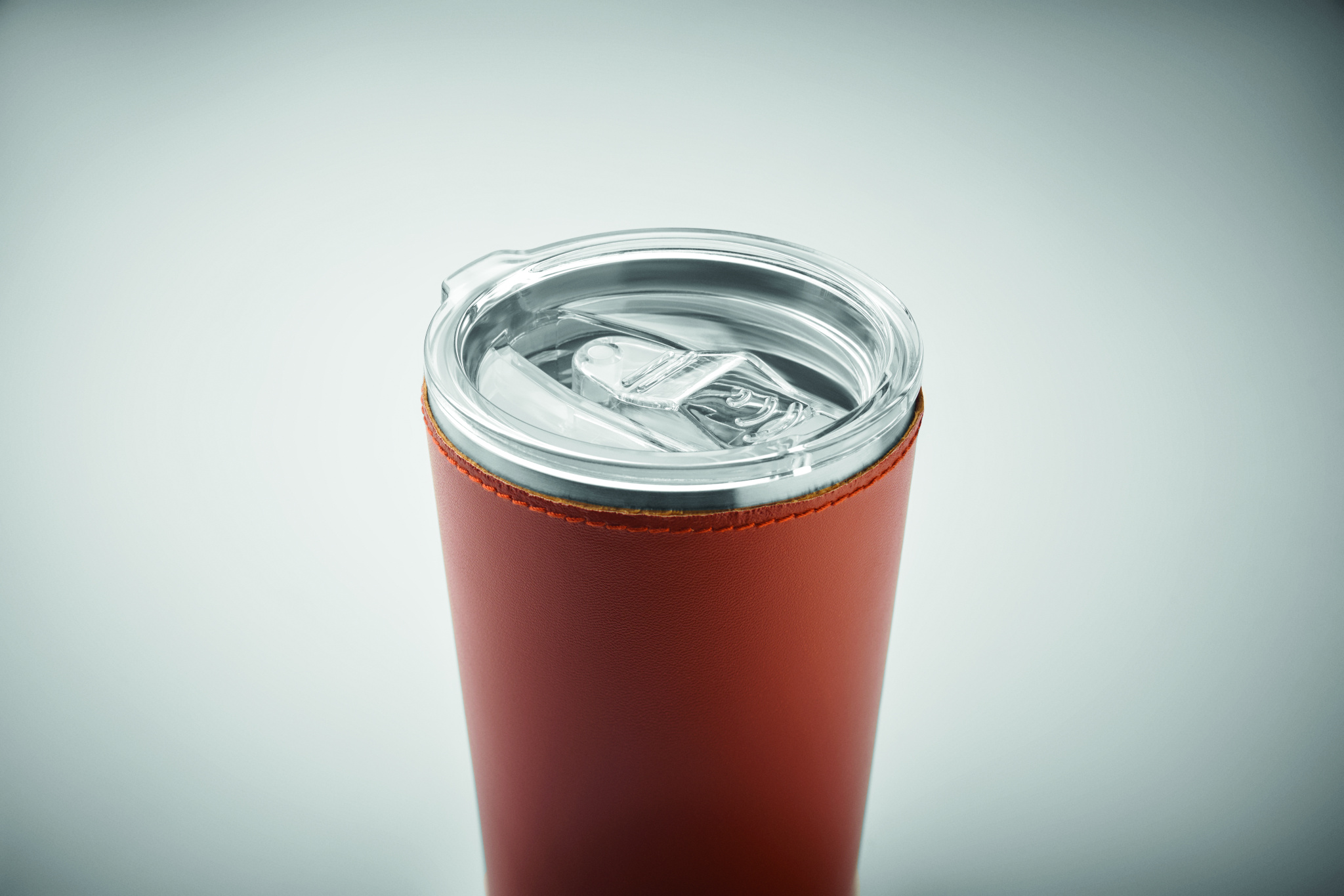 Kaksiseinämäinen juomalasi kierrätettyä ruostumatonta terästä (90 % kierrätettyä ruostumatonta terästä ja 10 % ruostumatonta terästä) irrotettavalla PU-nahkaholkilla. Kansi liukuvalla sip-reiällä. Vuotamaton. Tilavuus: 350 ml.