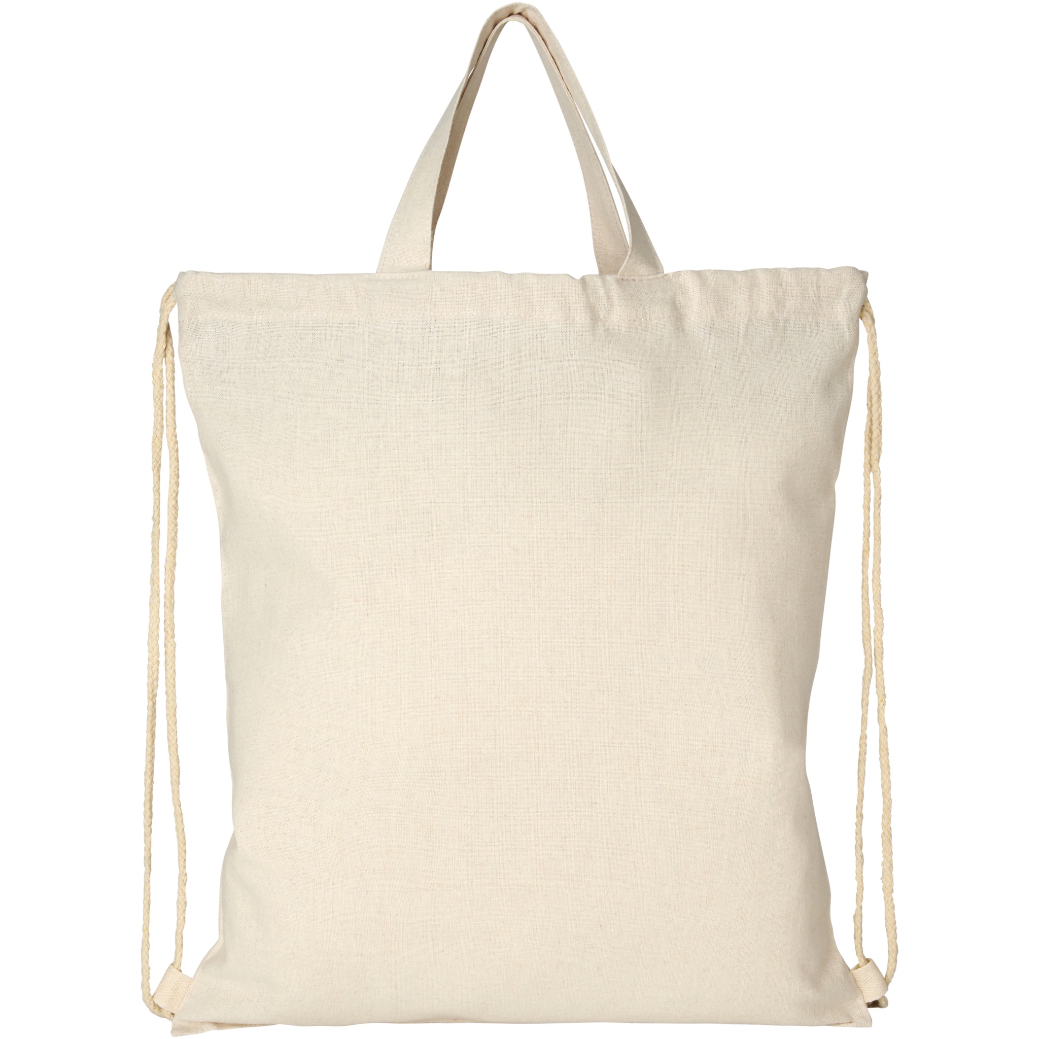 Kierrätetystä puuvillasta ja polyesteristä valmistettu kassi 210 g/m². Kierrätetty puuvilla valmistetaan valmistusmateriaalin ylijäämästä, jota syntyy tekstiilitehtaissa leikkaamisen aikana. Varsinaisen tuotteen väri saattaa vaihdella hieman tuotantoprosessin luonteen takia. Suuri päälokero ja puuvillaiset kiristysnyörit. Kaksi kahvaa, joiden korkeus on 14 cm. Kestää 5 kilon painon.