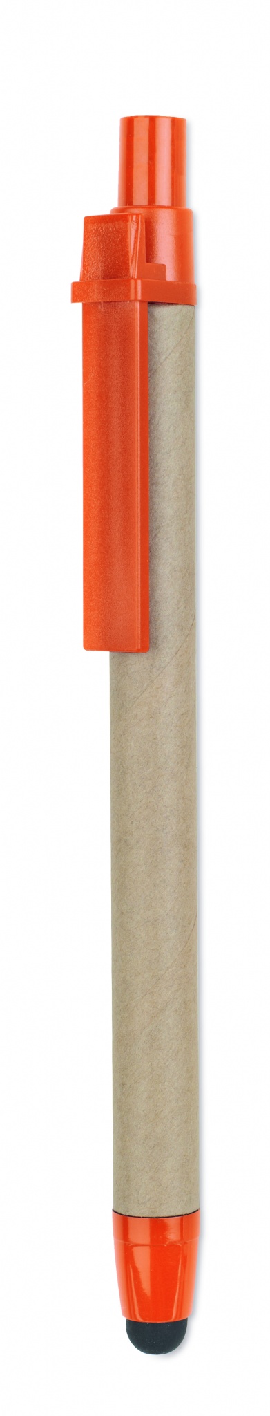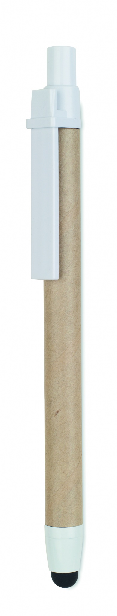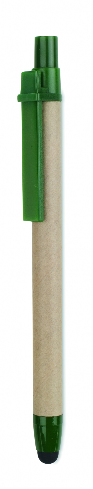 Kuulakärkikynä sinisellä musteella ja kosketusnäyttöpäällä. Kierrätyspaperista valmistettu runko, ABS- muovinen kärki ja klipsi.