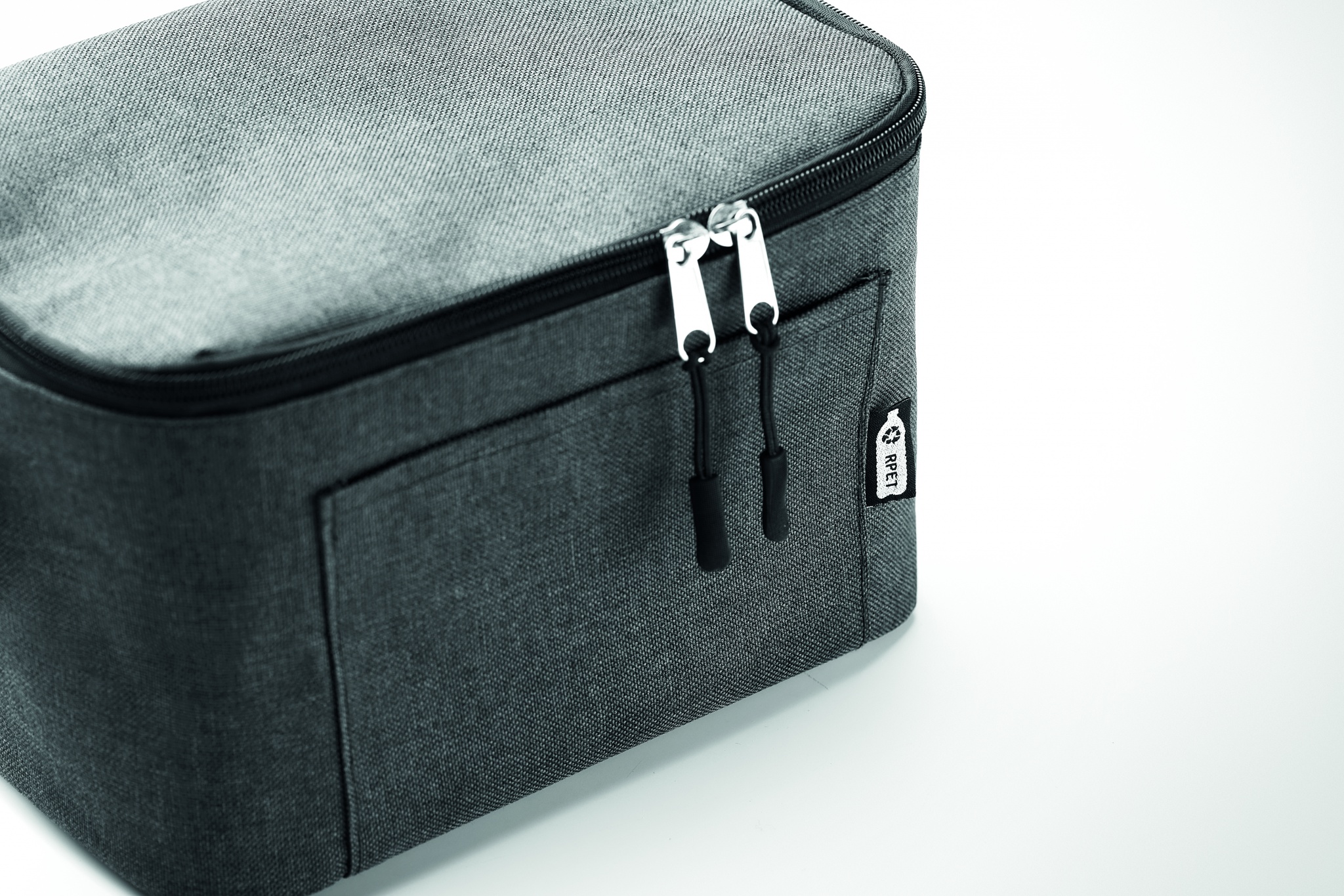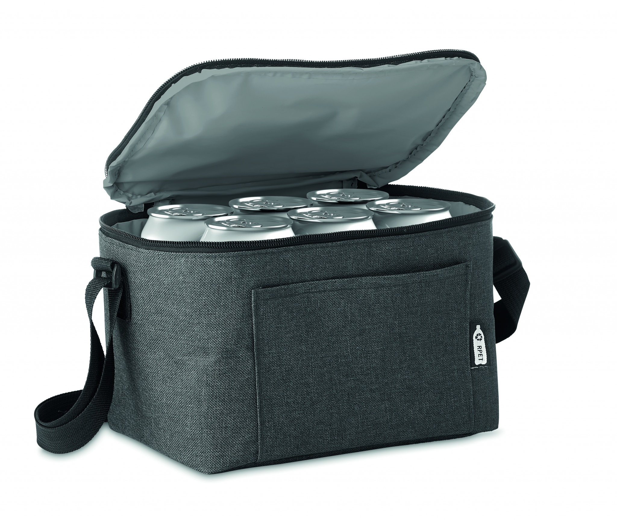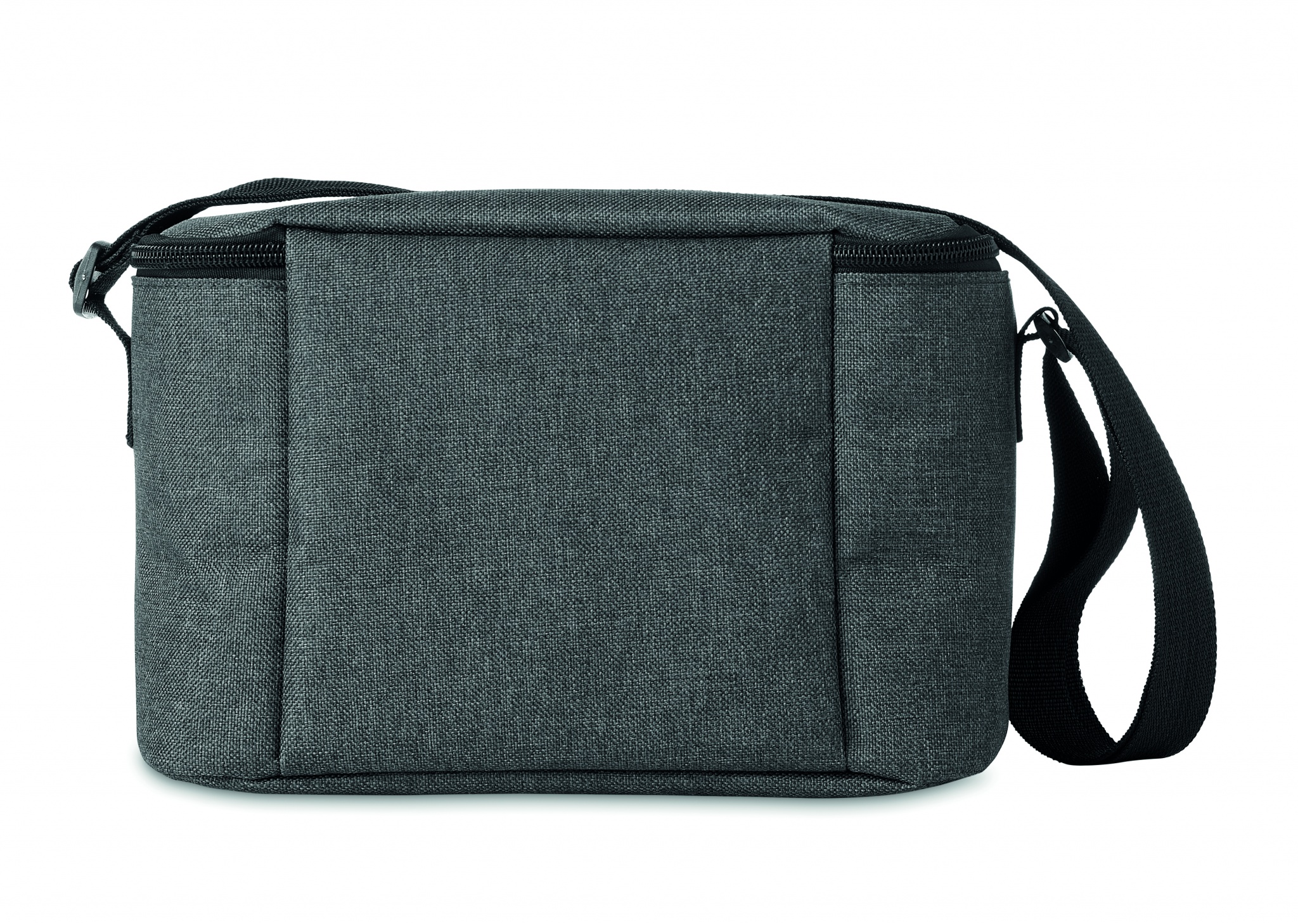 3 litran 2- sävyinen 600D RPET kylmälaukku 6 tölkille, edessä tasku. Eristysmateriaalina 0,15mm EVA ja 3mm vaahtomuovia.