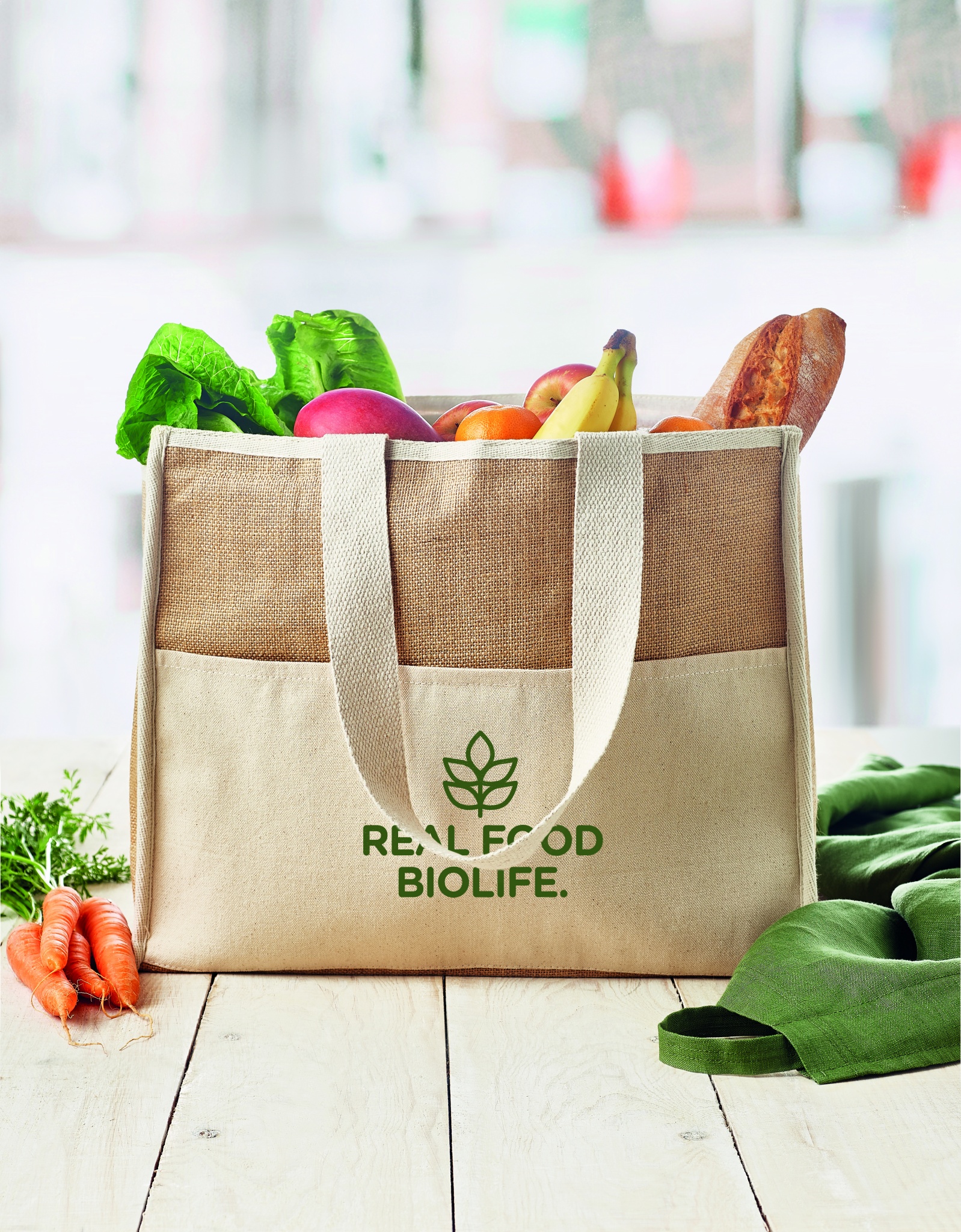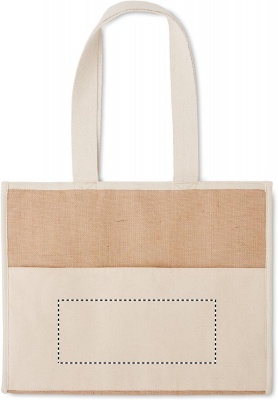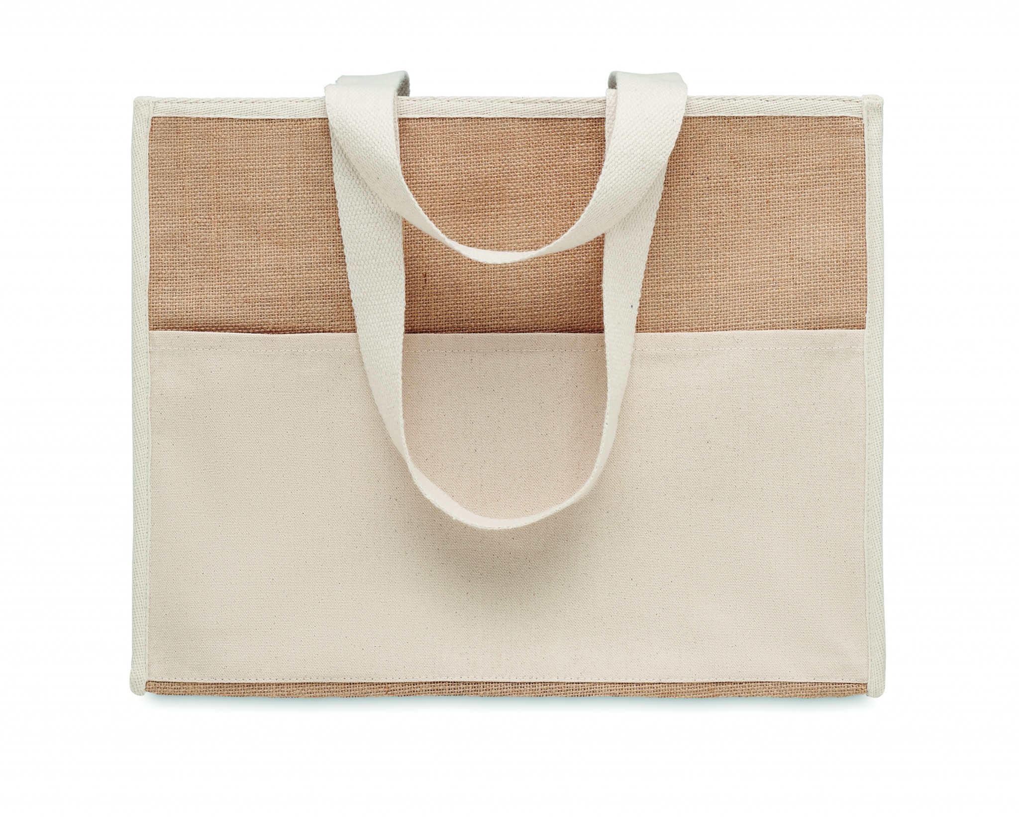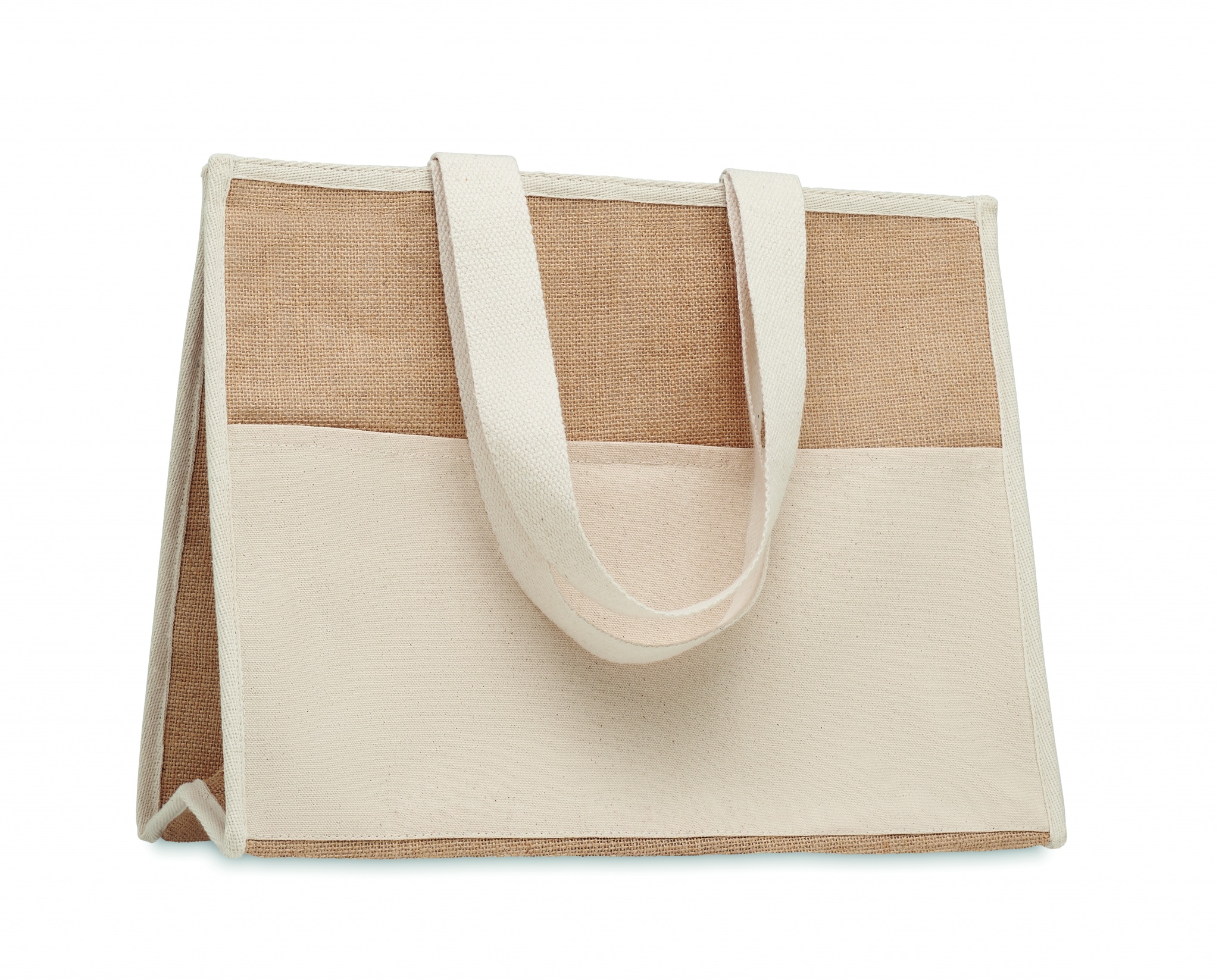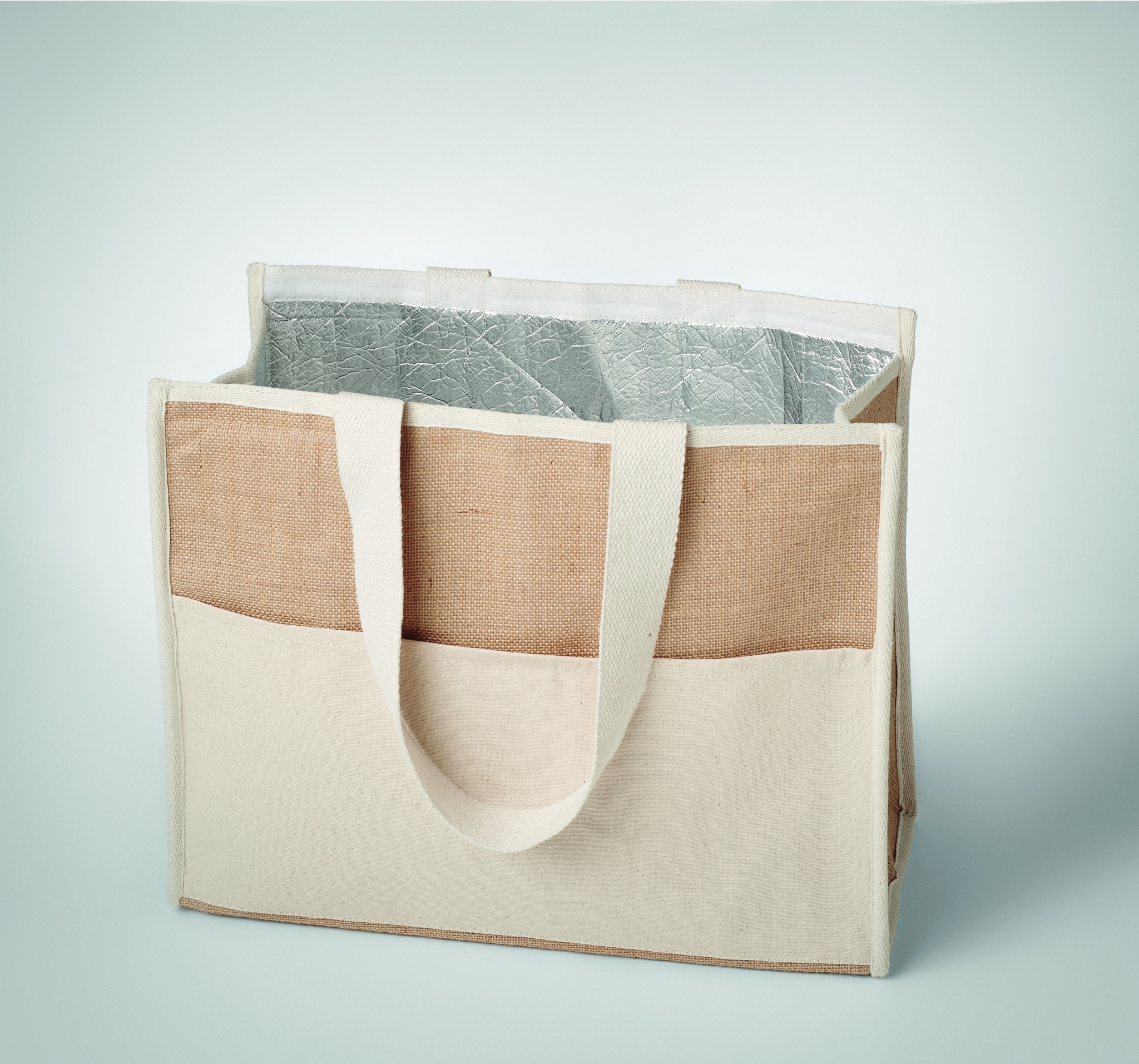 Juutti kylmälaukku, laminoitu sisäosa pitää tavarasi tuoreena. Pitkät kahvat, tarrakiinnitys ja edessä canvas tasku.