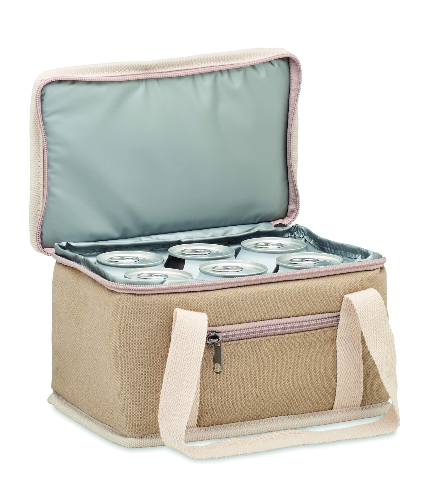 6 tölkin kylmälaukku, jonka materiaali on 320 gr/m² pesty puuvilla canvas, kantohihnat myös puuvillaa. Eristys 6mm PE vaahtomuovia.