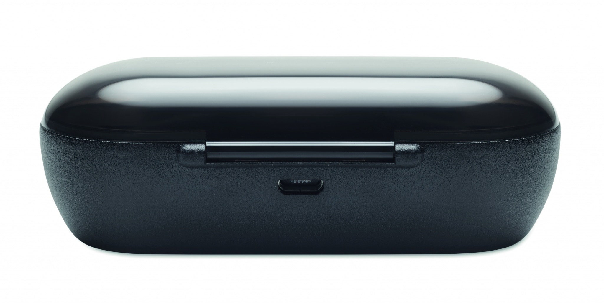 TWS 5.0 langattomat kuulokkeet, 45 mAh n akku. Arvioitu toistoaika noin 3 tuntia, sisältää mikro USB latauskaapelin. Toimitetaan latausasemana toimivassa rasiassa, latausasemassa uudelleen ladattava 250 mAh akku.