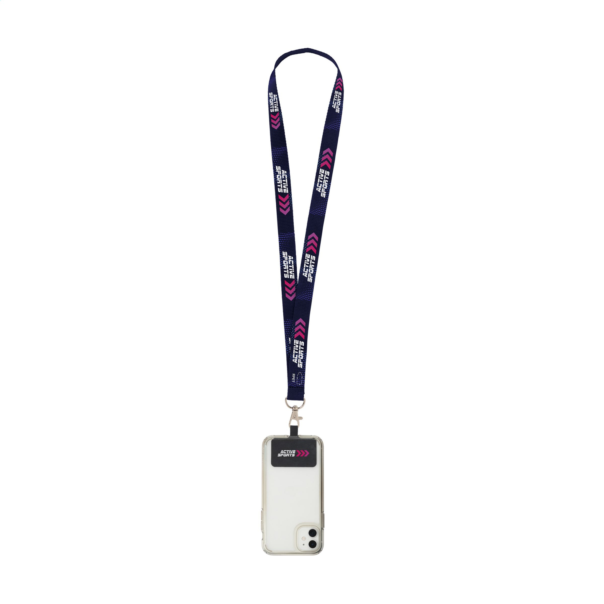Vahvasta kudotusta RPET-polyesteristä valmistettu kaulanauha (kierrätetyistä PET-pulloista). Mukana metallinen karabiini ja yleismerkki. Patch mahdollistaa älypuhelimen kiinnittämisen kaulanauhaan. Tämän yhdistelmän avulla voit kuljettaa älypuhelintasi turvallisesti kaulassasi. Tämä varmistaa, että sinulla on puhelin nopeasti käsillä ja voit pitää kätesi ja vaatetaskut vapaina. Tämä patch on yhteensopiva useimpien älypuhelinten ja koteloyhdistelmien kanssa, mutta ei koteloiden kanssa, joissa on avoin pohja. Järjestelmä on suunniteltu siten, että puhelimesi latausportti ei tukkeudu, vaikka se olisi kiinnitetty kaulanauhaan. Sisältää täysvärisen sublimaatiopainatuksen kaulanauhassa. Valmistettu Euroopassa.