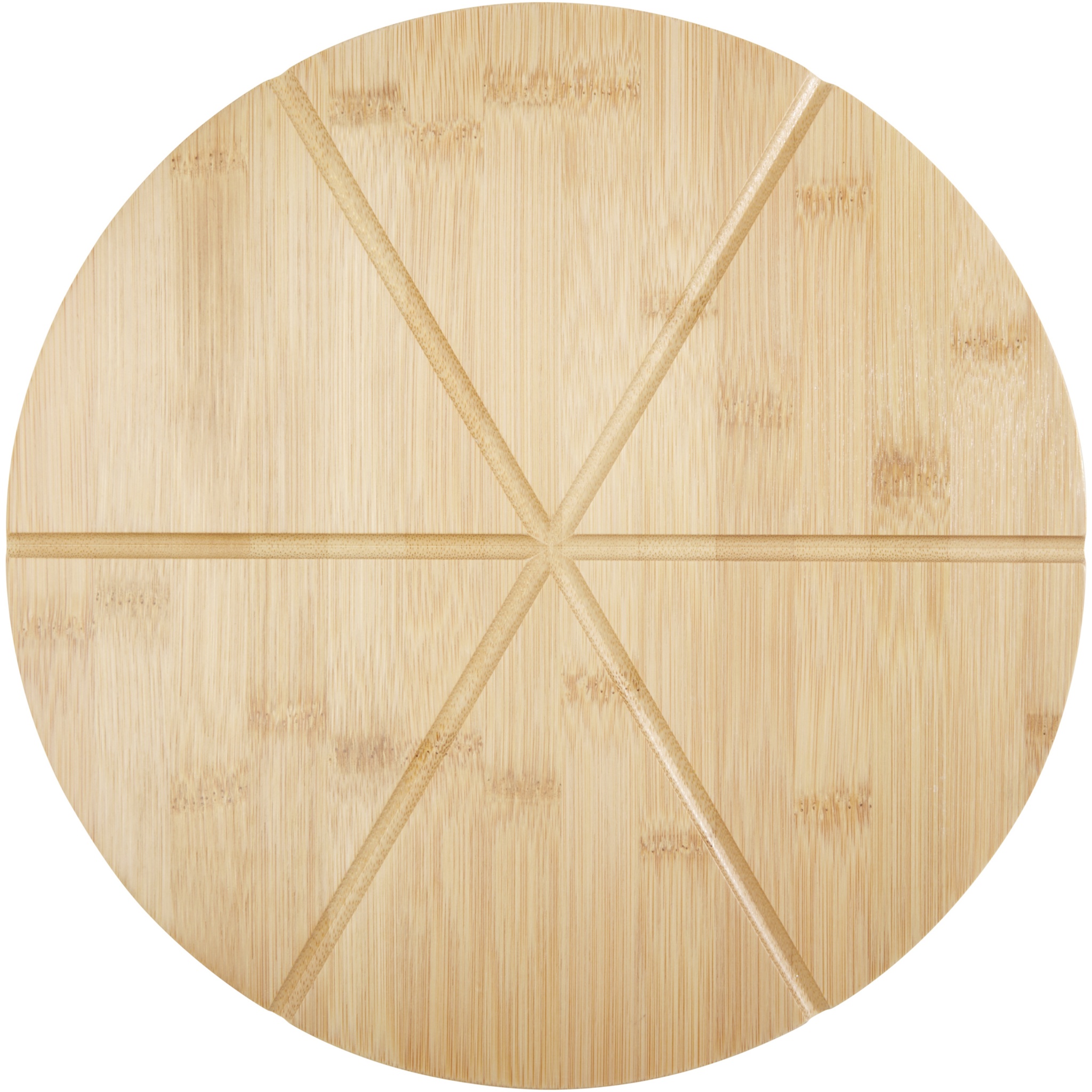 Bambuinen pizza-alusta, jossa on kuusi uraa viipalointia ja annostelua varten sekä pizzaleikkuri ja pizzantarjoilulasta. Bambu on hankittu ja valmistettu kestävän kehityksen standardien mukaisesti.
