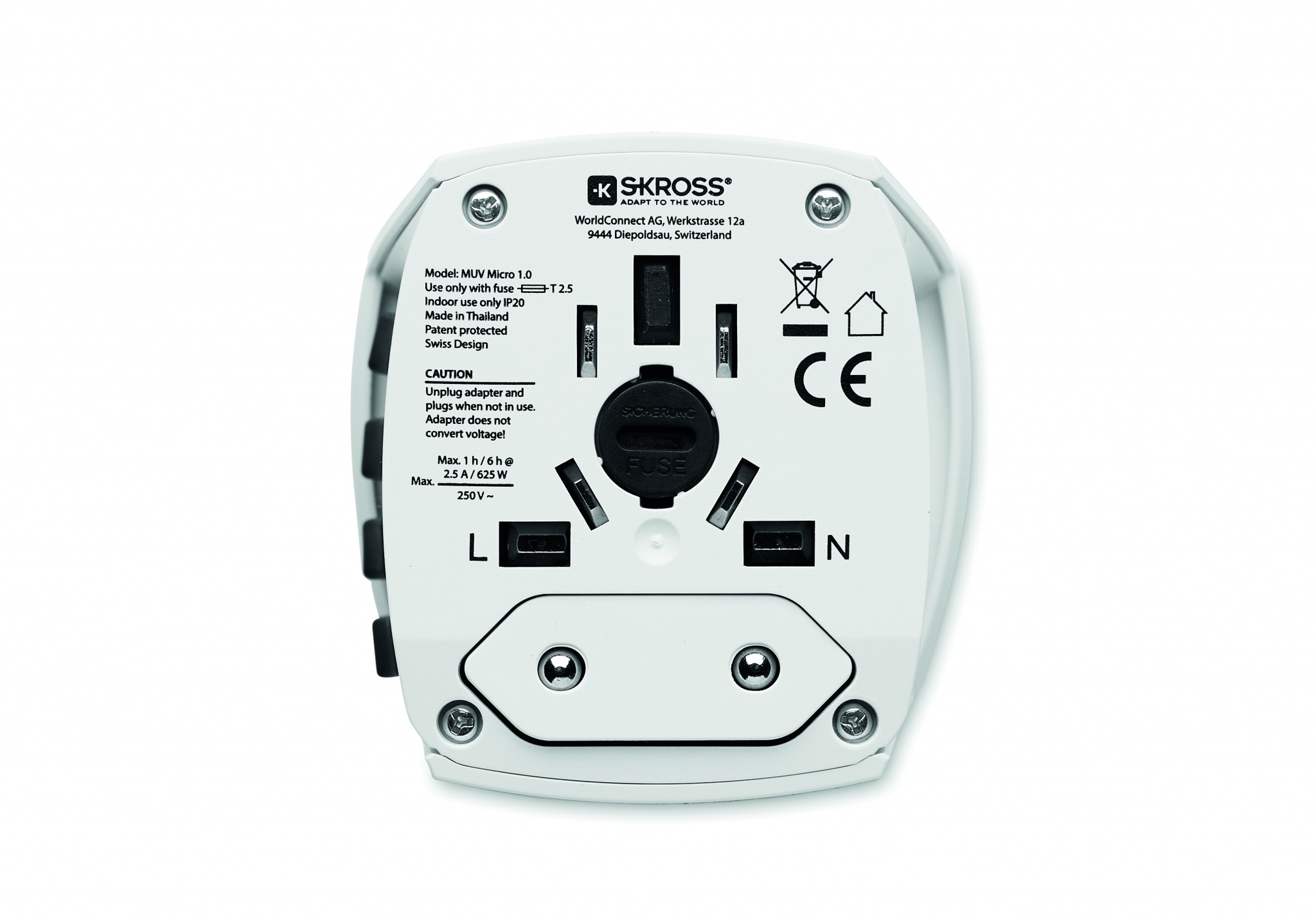 Universal SKROSS® -matka adapteri. Liittimet Eurooppaan, Yhdysvaltoihin / Japaniin, Australiaan / Kiinaan, ja 2-napainen, maadoittamaton liitin. Täyttää kaikki kansainväliset turvallisuuteen liittyvät standardit ja vaatimukset. Lapsi turvallinen.