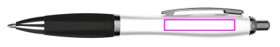 Kuulakärkikynä, jossa valkoinen piippu, metallipidike, sininen kirjoitus iso täyttö ja värillinen pehmeä kosketuskahva. Painamme logosi leikkeen oikealle puolelle.