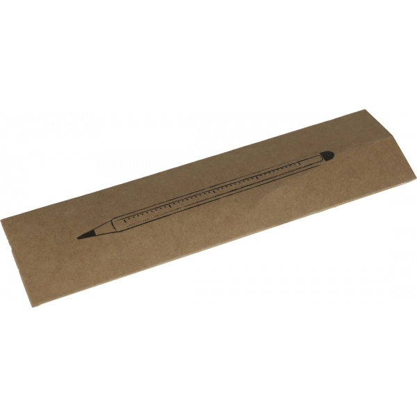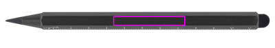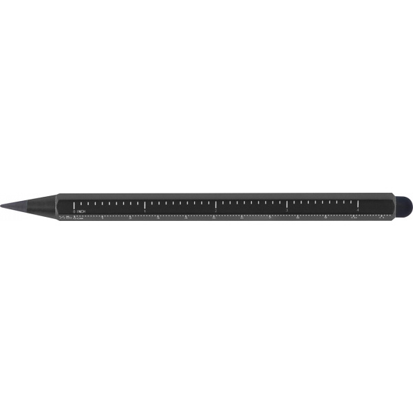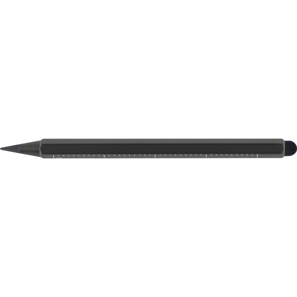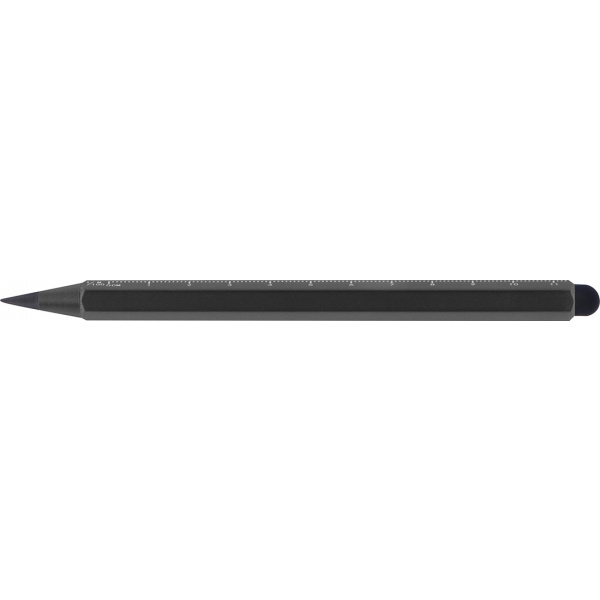Alumiininen musteton kynä, jossa on kosketustoiminto ja asteikko cm ja tuuma. Lyijy on valmistettu grafiitin ja metallin sekoituksesta, mikä tekee siitä erittäin kestävän. Logosi kaiverretaan piipun vapaaseen tilaan.