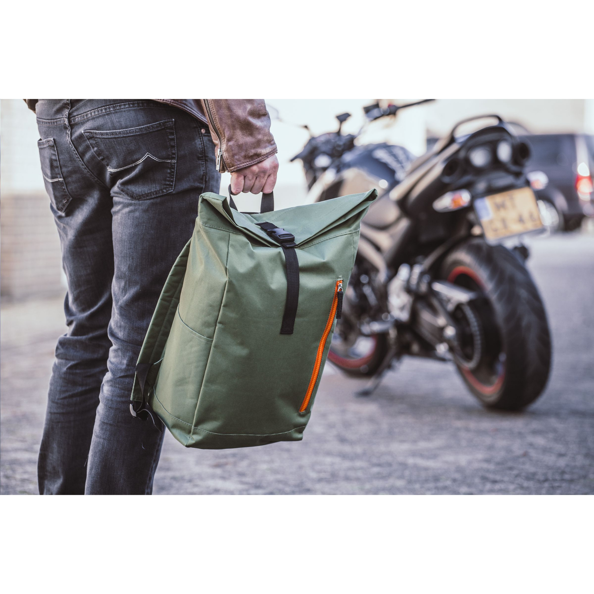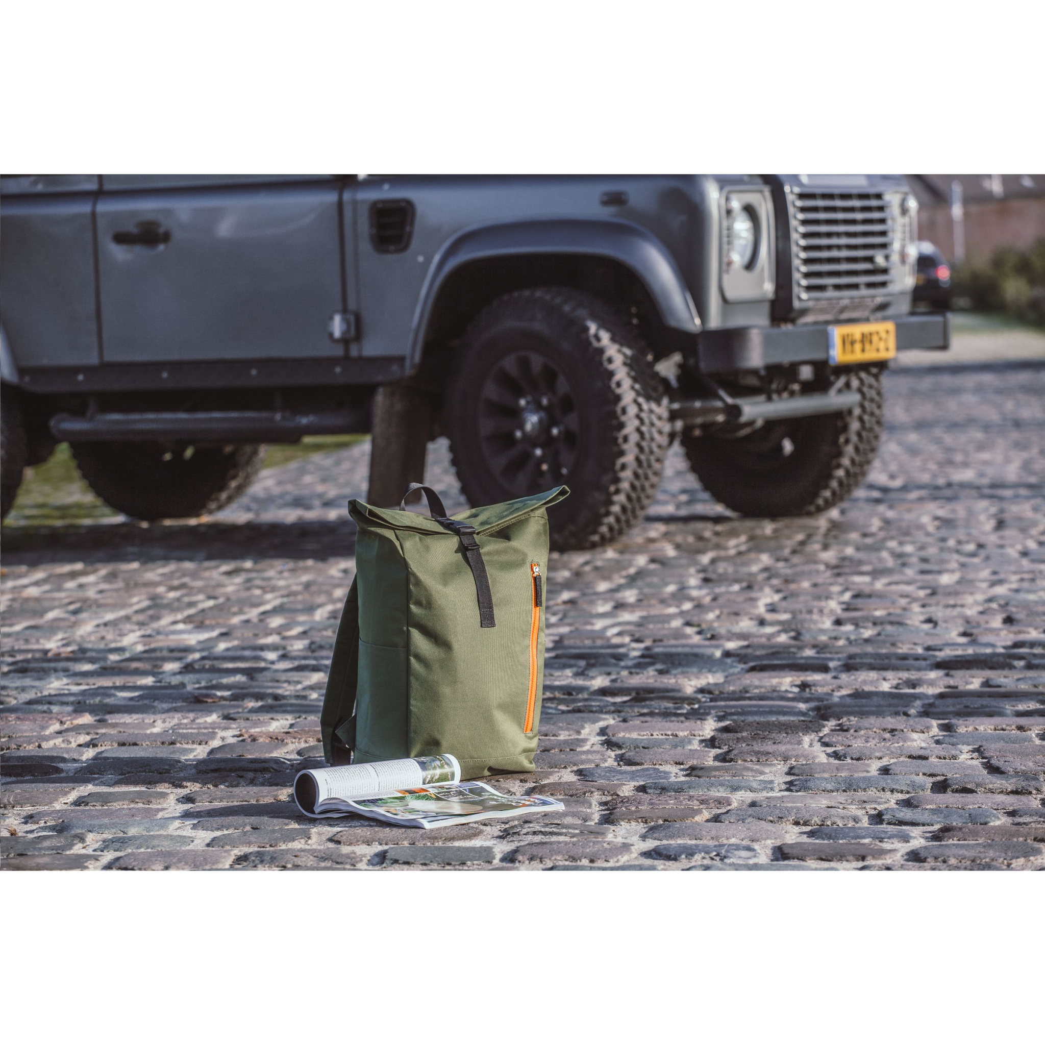 Kestävä, käytännöllinen urbaani "roll-top" reppu, joka on valmistettu vahvasta 600D polyesterista, vedenpitävällä PVC-sisällä, osittain nylonvuorattu. Repussa on yksi iso sisätasku, tasku molemmilla sivuilla ja suuri vetoketjutasku edessä. Mukavuutta lisäävä vaahtomuoviselkä, pehmustetut, säädettävät olkaimet ja käsilenkki. Kantohihnalla ja rullasuljuksella, jossa on kätevä napsautusjärjestelmä yläosassa. Täydellinen laukku päivittäiseen käyttöön. Kapasiteetti n. 18 litraa.