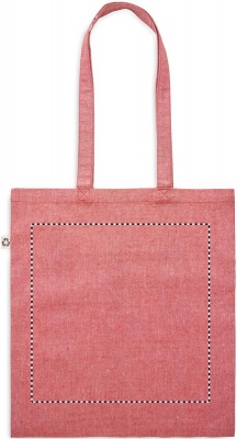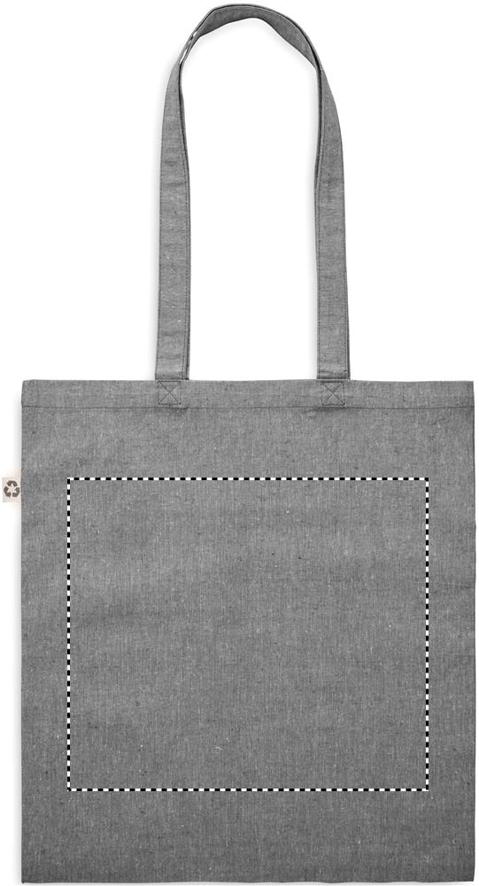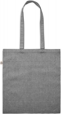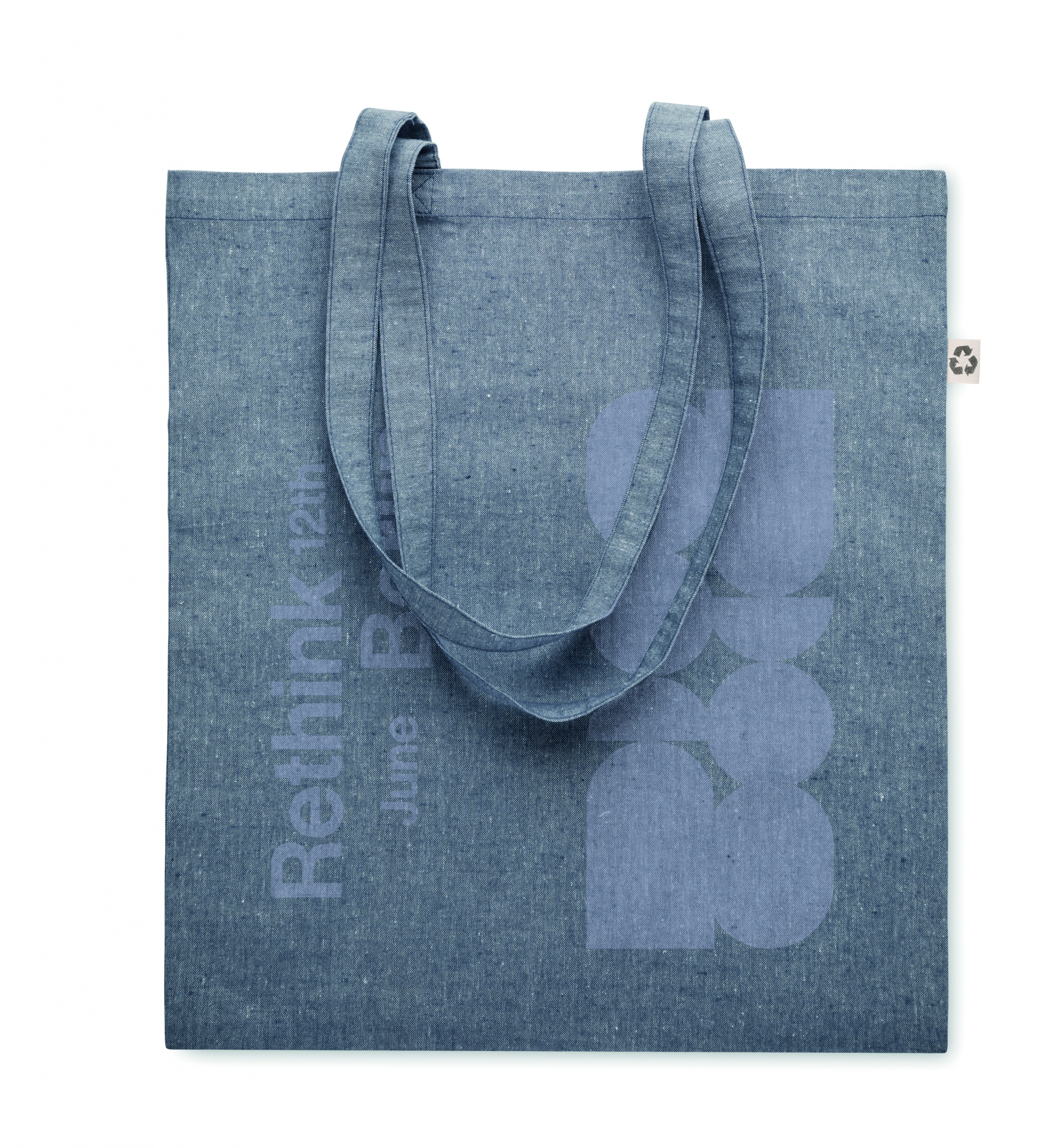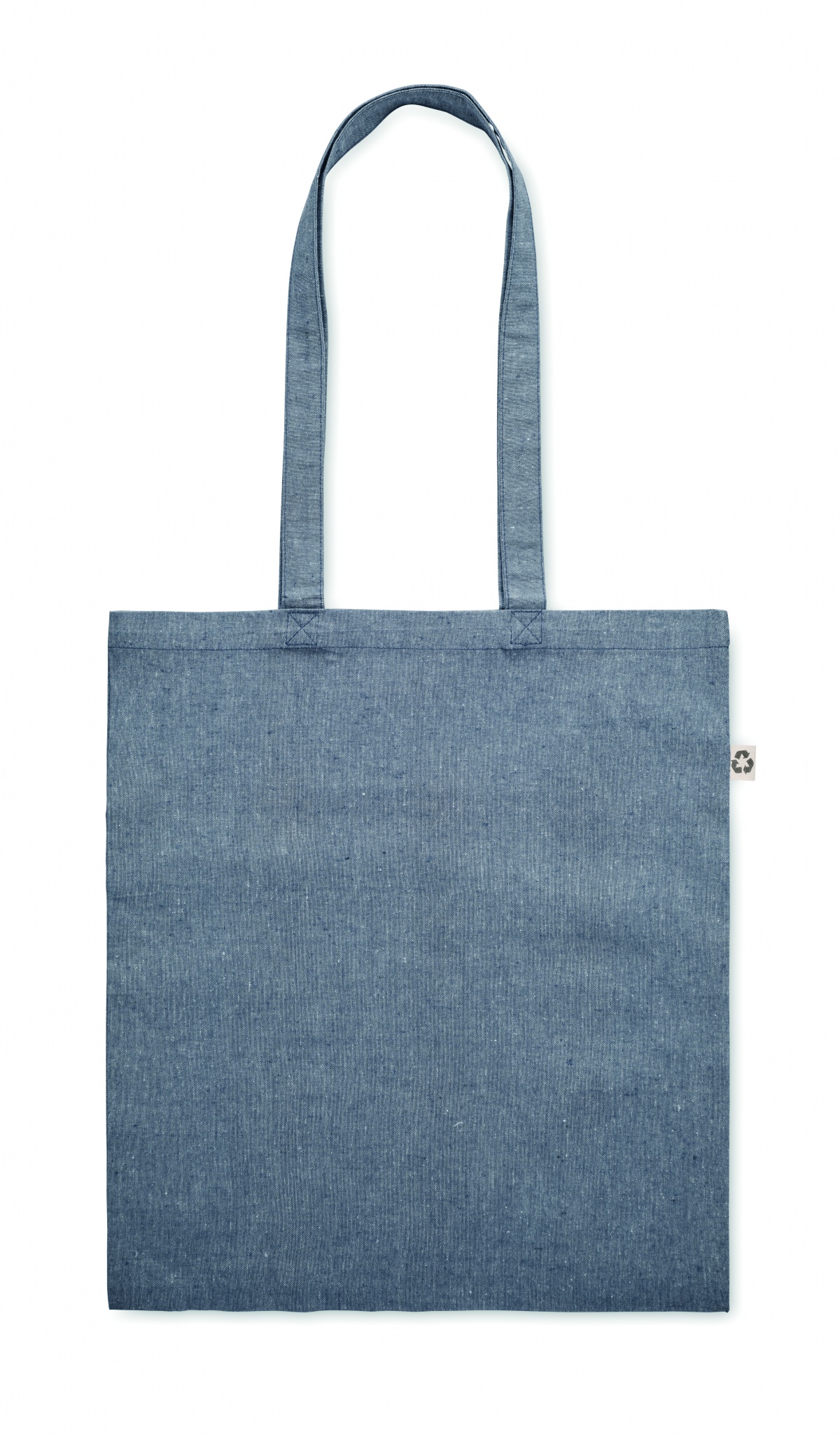 Kierrätyspuuvillasta valmistettu ostoskassi jossa pitkät kahvat. Materiaali 80 % kierrätyspuuvillaa/20 % puuvillaa, 140 gr/m².