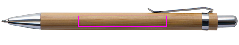 Bambusta valmistettu kuulakärkikynä, jossa sininen kirjoitus suuri täyttö. Viimeistely tehdään laserkaiverruksella klipsien alle.