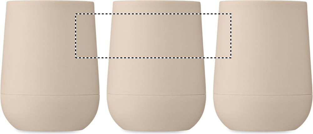 Kaksiseinämäinen juomalasi PP:tä, liukukansi suukappaleen kansi PS ja ABS. Tilavuus: 300 ml.