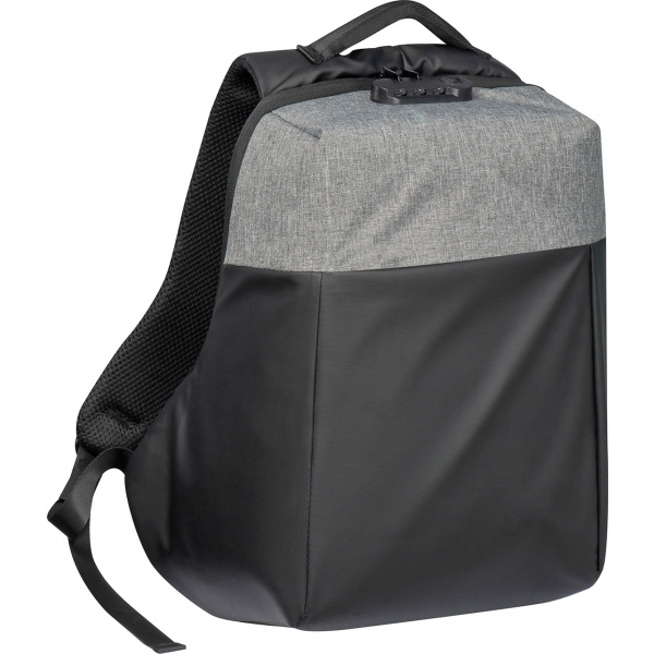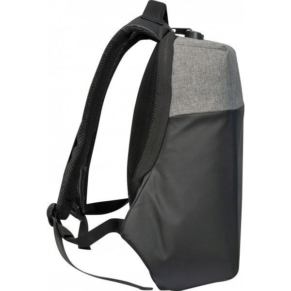Kärryyn valmis varkaudenesto kovakuorinen reppu 600D polyesterista lisäominaisuuksilla: Päälokeron yhdistelmälukko, varkaudenestoosasto takana, pieni vetoketjullinen lokero pehmustetussa olkahihnassa, pehmustettu takapaneeli, pehmustettu kantokahva, kannettavan tietokoneen lokero jossa etutasku ja joustavat olkaimet, USB-portti powerbankin liittämistä varten (ei mukana), neljä kynälenkkiä, aukko kuulokkeille, kolme taskua ja irrotettava avainrengas. Sisällä on kaksi tarranauhakiinnitystä, joten reppu voidaan avata joko osittain tai kokonaan. Logosi asetetaan etupuolelle.