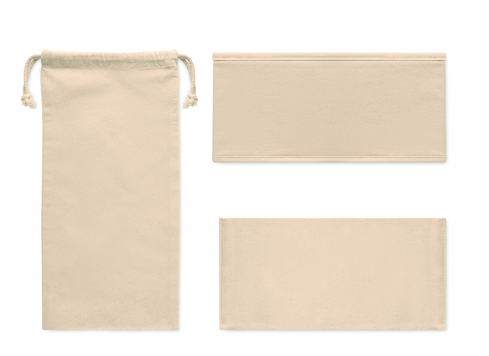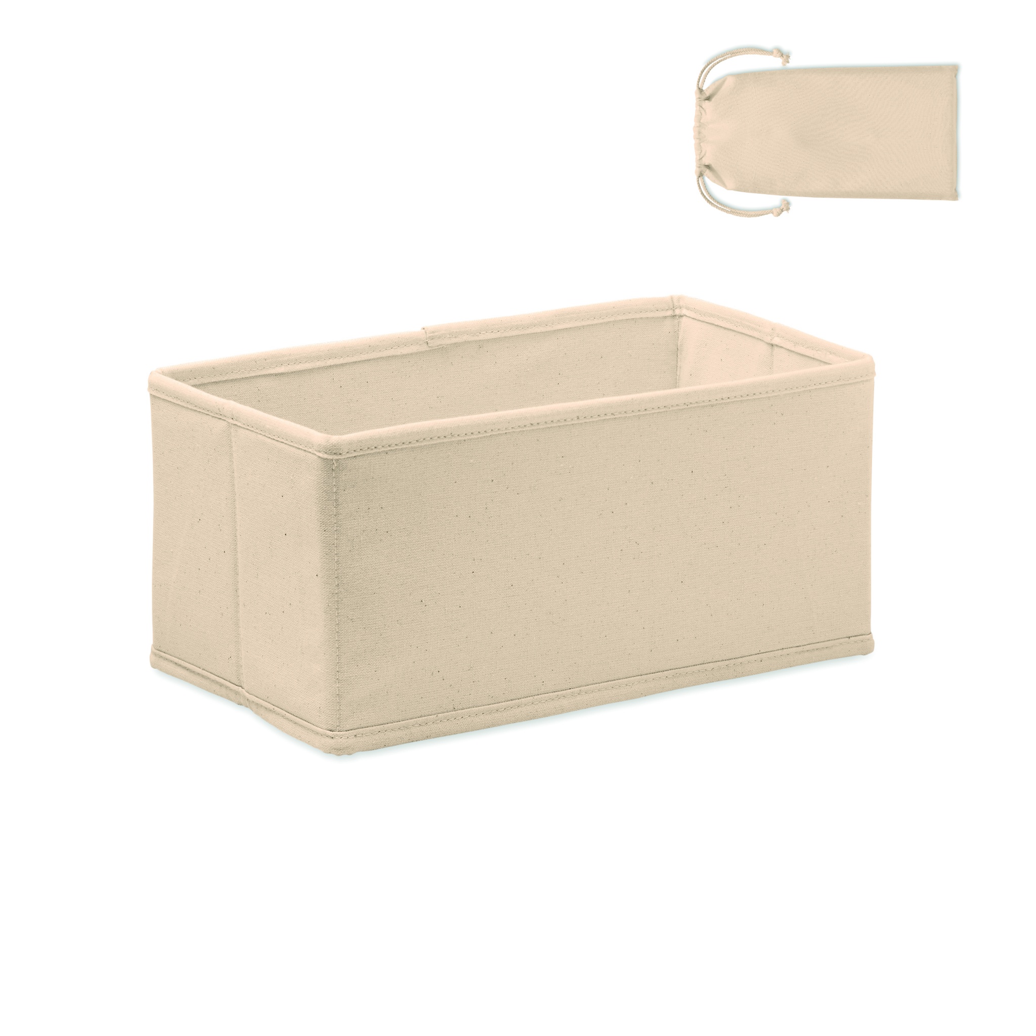 Keskikokoinen kokoontaitettava tarvike- tai säilytyslaatikko puuvillaa (220 gr/m²). Toimitetaan puuvillaisessa (140 gr/m²) kiristysnauhapussissa.