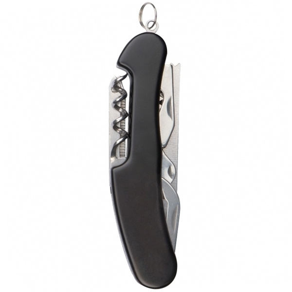 14-osainen ruostumattomasta teräksestä valmistettu taskuveitsi, joka sisältää: tölkinavaaja, sakset, koukunpoistoaine, kalansoveltaja, sahaveitsi, veitsi, uraruuvimeisseli, tölkinavaaja, avaimenperä, korkkiruuvi, kynsiviila, kaavin ja ristipääruuvimeisseli. Kaiverremme logosi veitseen.