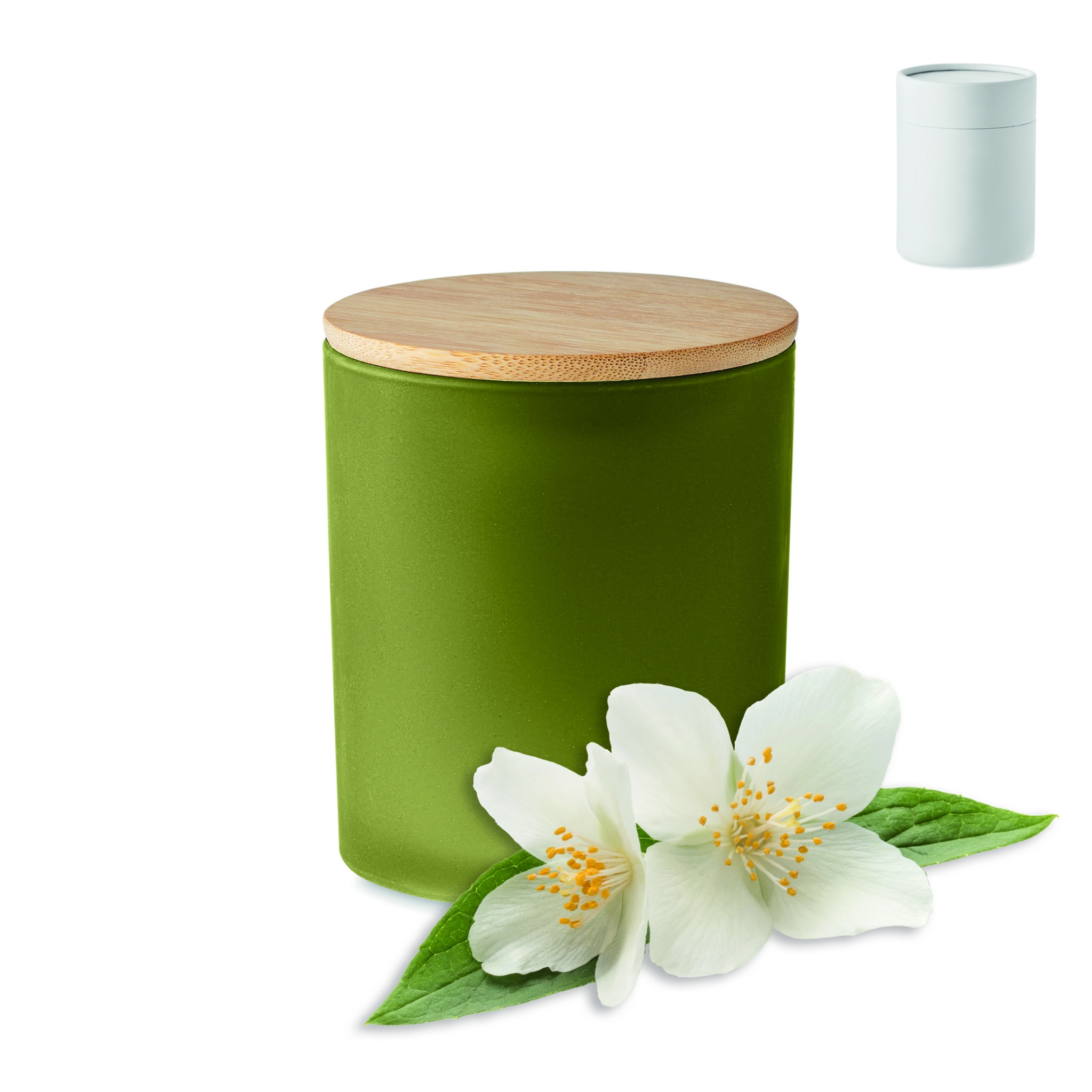120 gr tuoksuvahakynttilä huurretussa lasissa bambukannella. Pakattuna pahvipakkaukseen juuttinarulla ja voimapaperi kortilla. Arvioitu paloaika 20 tuntia.