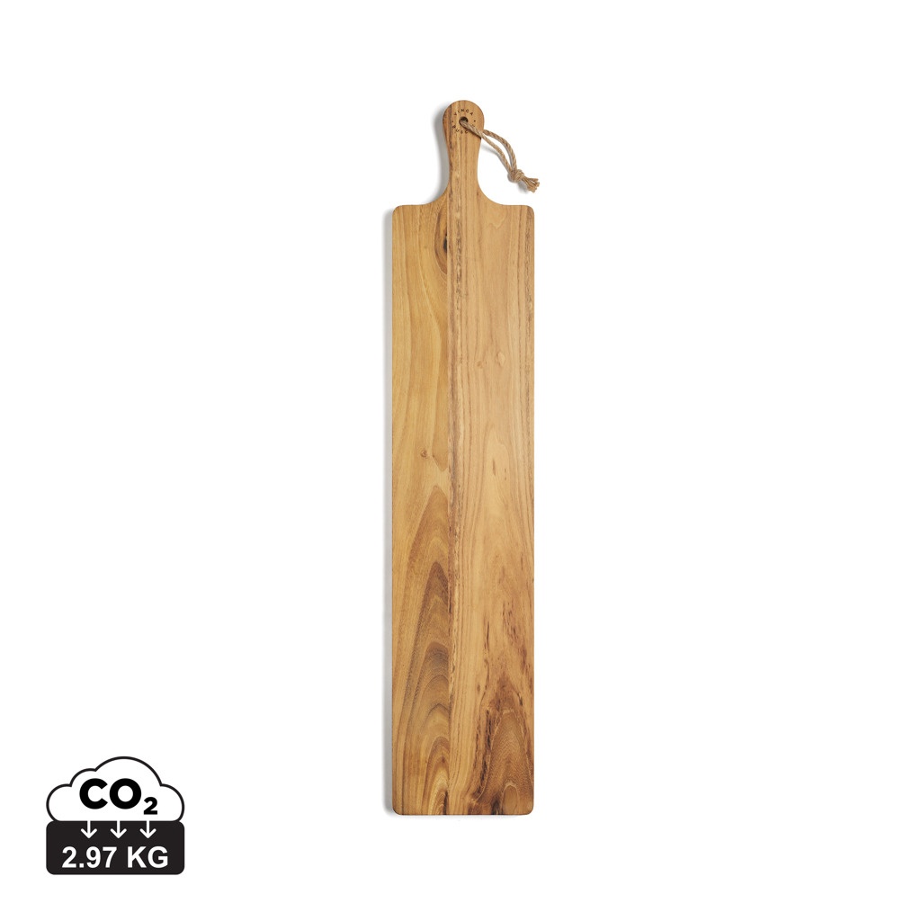 Erittäin vankka ja käytännöllinen leikkuu-/tarjoilulauta, joka kokonsa puolesta (75cm pitkä, 15cm leveä) on riittävän suuri sekä leikkuulaudaksi että tarjoiluun. Lauta on valmistettu FSC®-sertifioidusta teakpuusta, ja sen kultaisesta keskiruskeaan vaihteleva puupinta tummuu kauniisti ajan myötä. Korkea öljypitoisuus takaa laudalle tehokkaan suojan ja pitää sen pitkään erinomaisessa kunnossa.