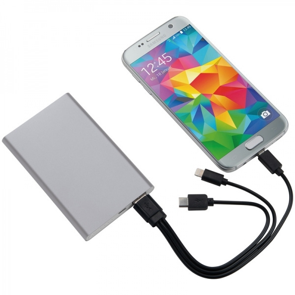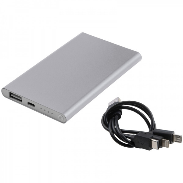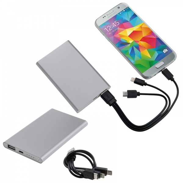 Aliuminio maitinimo blokas su 4 000 mAh įkrovimo talpa, įkrovimo indikatoriumi, kelių kištukų įkrovimo laidu (Lightning, USB Type C ir Micro-USB.) Jūsų logotipas bus išgraviruotas.