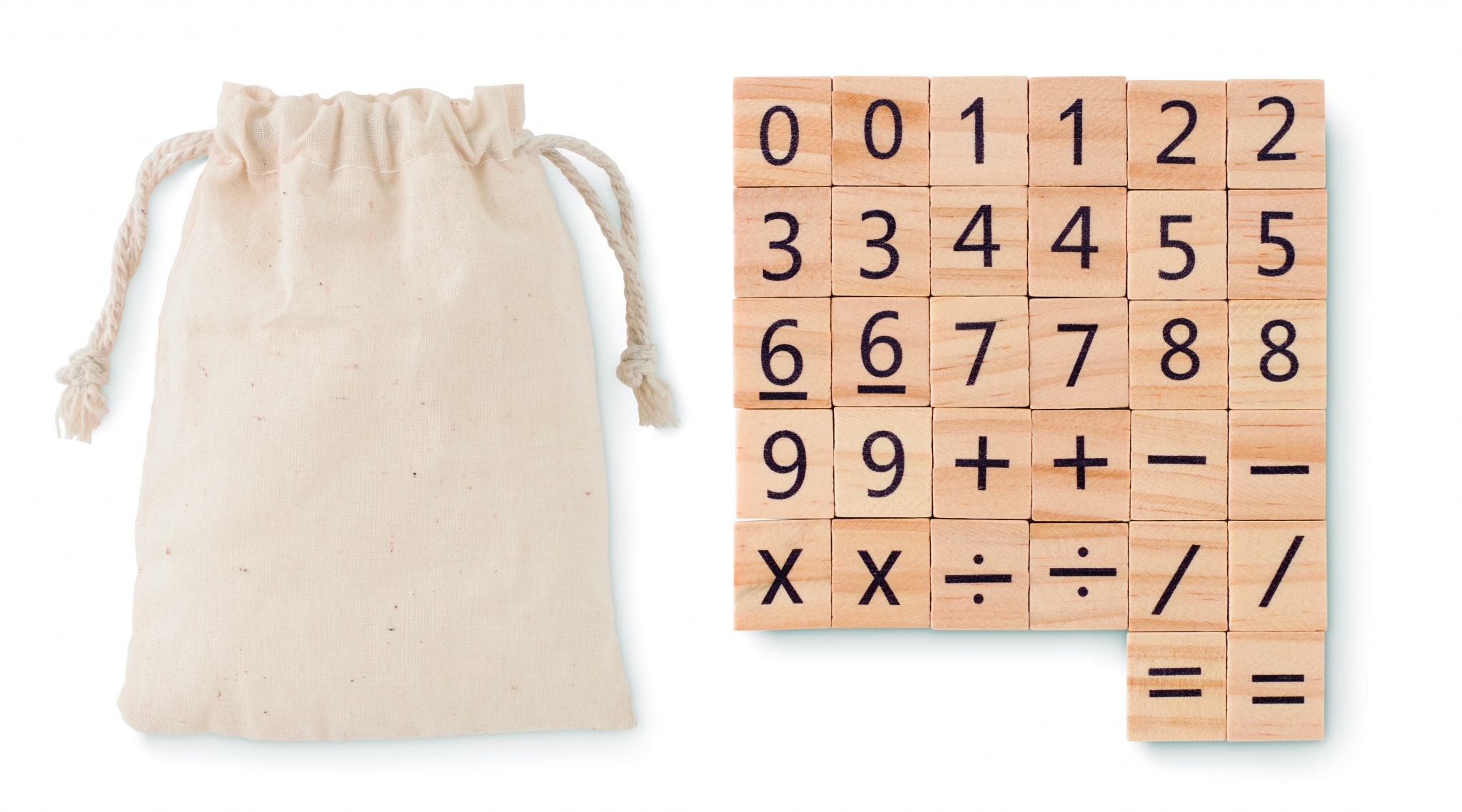 Medinis mokomasis skaičiavimo žaidimas medvilniniame maišelyje. Komplekte 32 vnt.