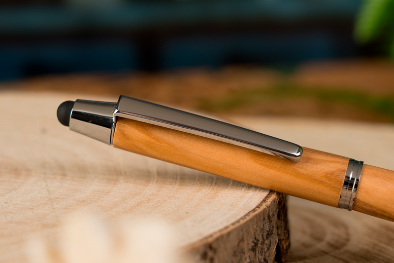 Tušinukas pagamintas iš alyvmedžio, su lietimo funkcija ir mėlynu rašymo užpildu. Jūsų logotipas bus išgraviruotas po klipu.