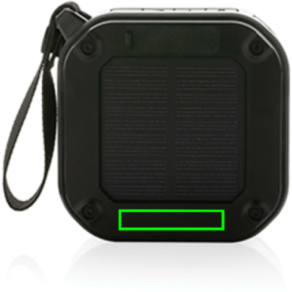 Jaudīgs 3 W bezvadu skaļrunis ar iebūvētu saules paneli aizmugurē, kas izgatavots no RCS sertificētas otrreizējās pārstrādes ABS. Kopējais pārstrādātais saturs: 38% no kopējā preces svara. RCS sertifikācija nodrošina pilnībā sertificētu pārstrādāto materiālu piegādes ķēdi. Skaļrunis izmanto augstas kvalitātes monokristāliskos saules paneļus ar 19% konversijas likmi. Maksas likme ir atkarīga no apstākļiem. Saules uzlādes ātrums: 5V/80mA. Skaļrunis ir aprīkots ar 400 mAh akumulatoru, lai nodrošinātu līdz pat 5 stundām atskaņošanas laiku, un BT5.3 vienmērīgam savienojumam un skaidrai skaņai. Savienojuma diapazons līdz 10 metriem. Ar mikrofonu un paņemšanas funkciju, lai atbildētu uz zvaniem. Ar integrētu 30 lūmenu LED gaismu. Iepakots FSC mix FSC® kastē. Ietver RCS sertificētu pārstrādātu TPE uzlādes kabeli. Prece un aksesuāri 100% bez PVC. IPX 5 ūdensizturīgs.
