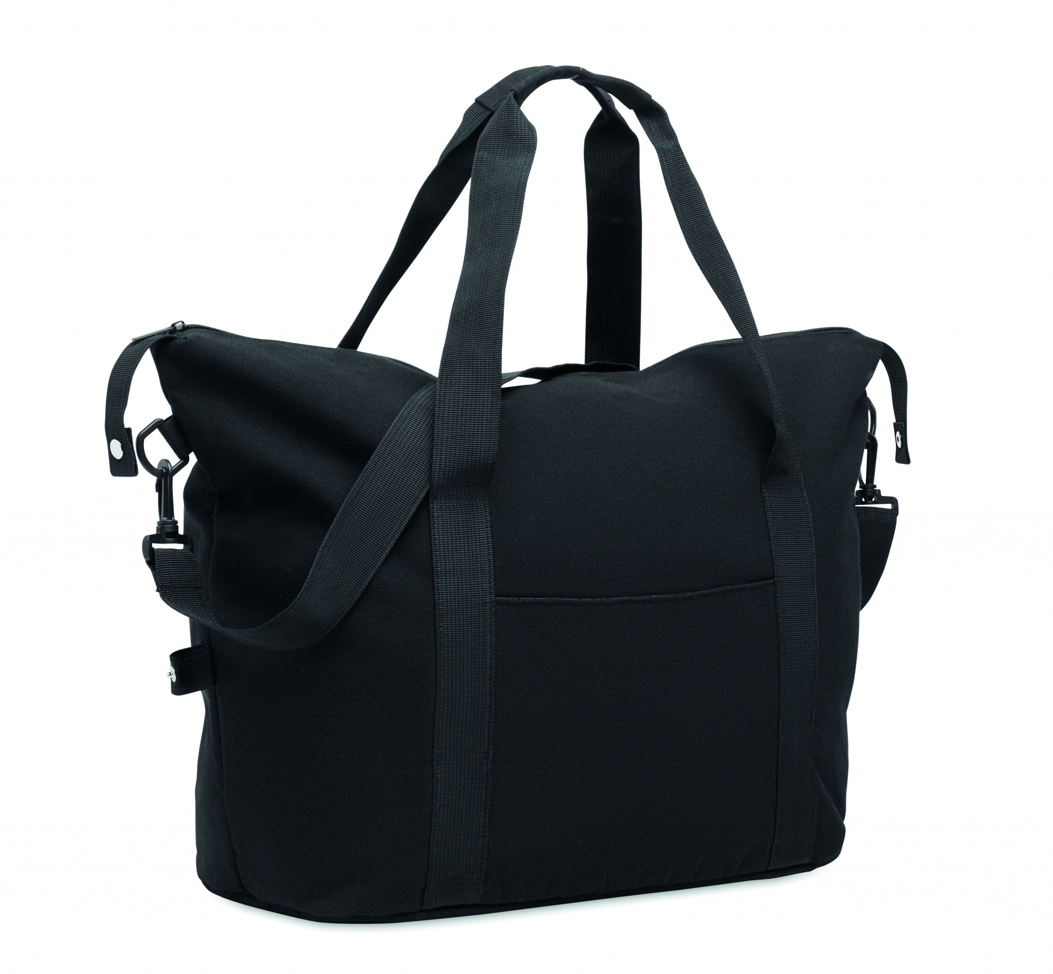 Nedēļas nogales soma no otrreizējās lietošanas kokvilnas un pārstrādāta poliestera (70%/30%) ar oderi 210D RPET poliestera. Tam ir priekšējā kabata, aizmugurējā kabata ar rāvējslēdzēju, noņemama un regulējama plecu siksna un polsterēta apakšdaļa. Ratiņu turētājs aizmugurē.