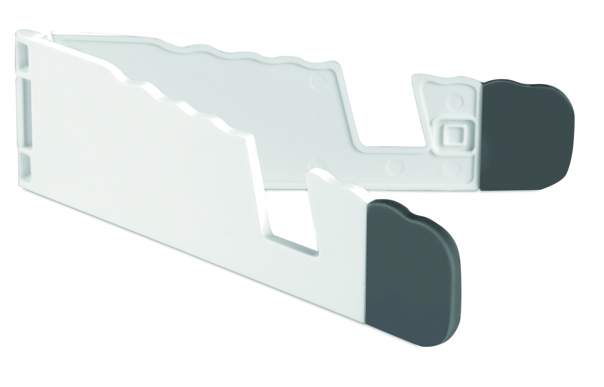 Grafiskās planšetdatora un viedtālruņa salokāms turētājs baltā ABS ar pelēku silikona galu.
