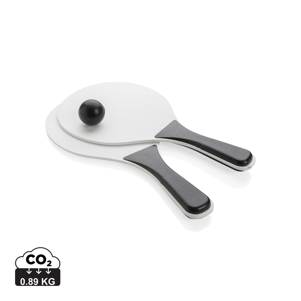 MDF pludmales bumbu komplekts ar PP rokturi. Iepakots tīklā, ieskaitot 1 bumbiņu.