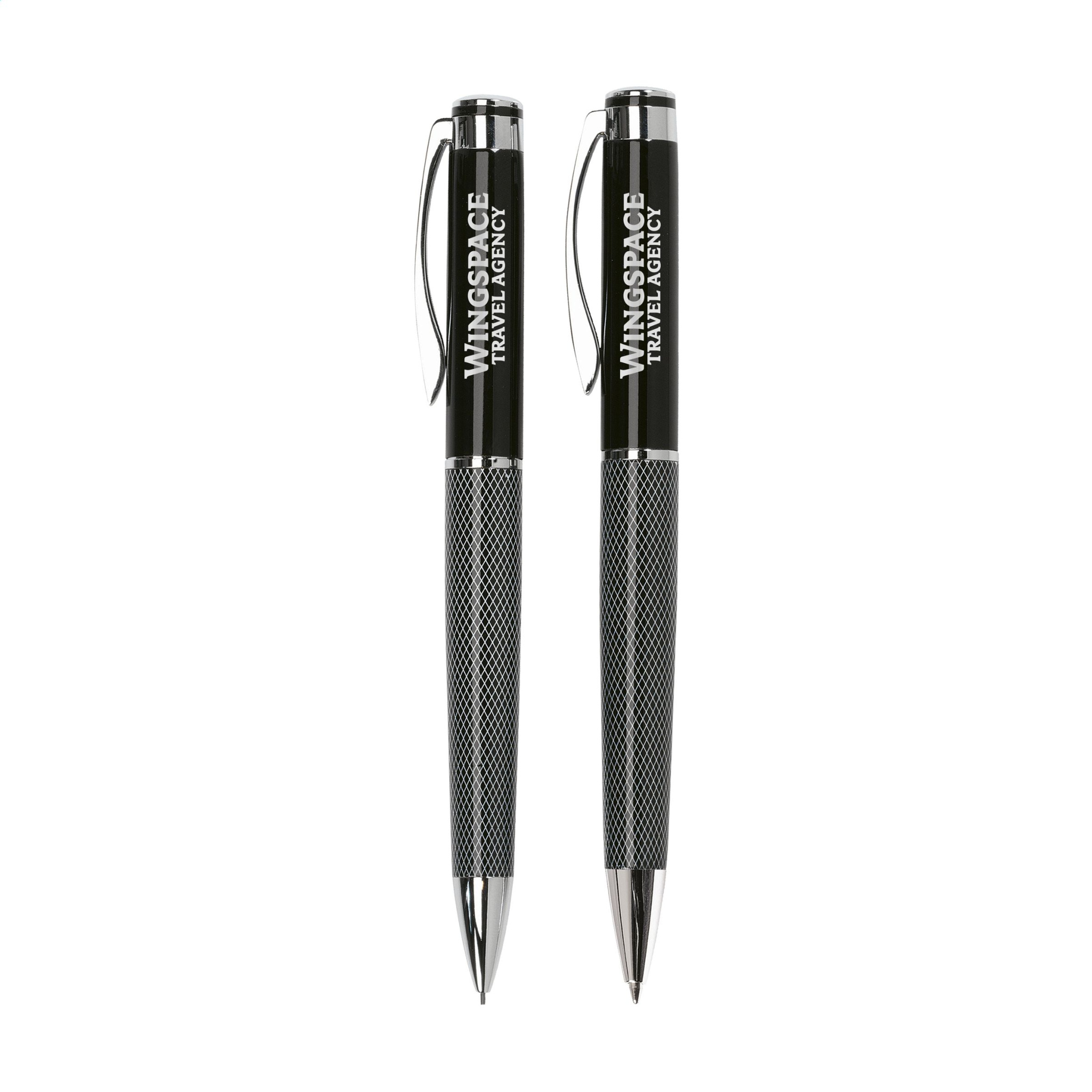 Rakstīšanas komplekts: zilas tintes lodīšu pildspalva ar griežamu galu un atkārtoti uzpildāms zīmulis ar 3 HB uzpildījumiem (0,9 mm). Abi ar metāla apdari. Kādā gadījumā.
