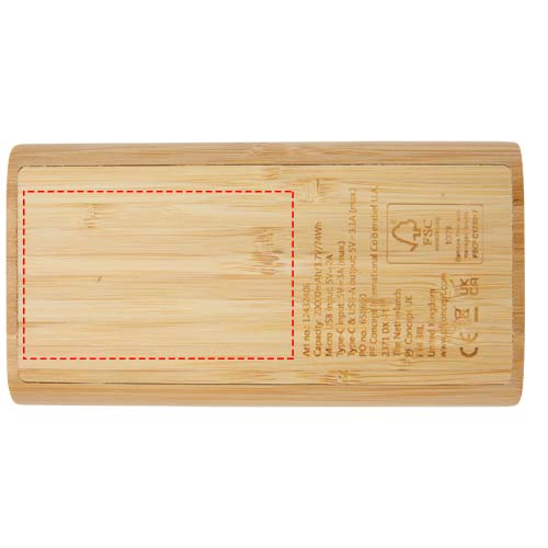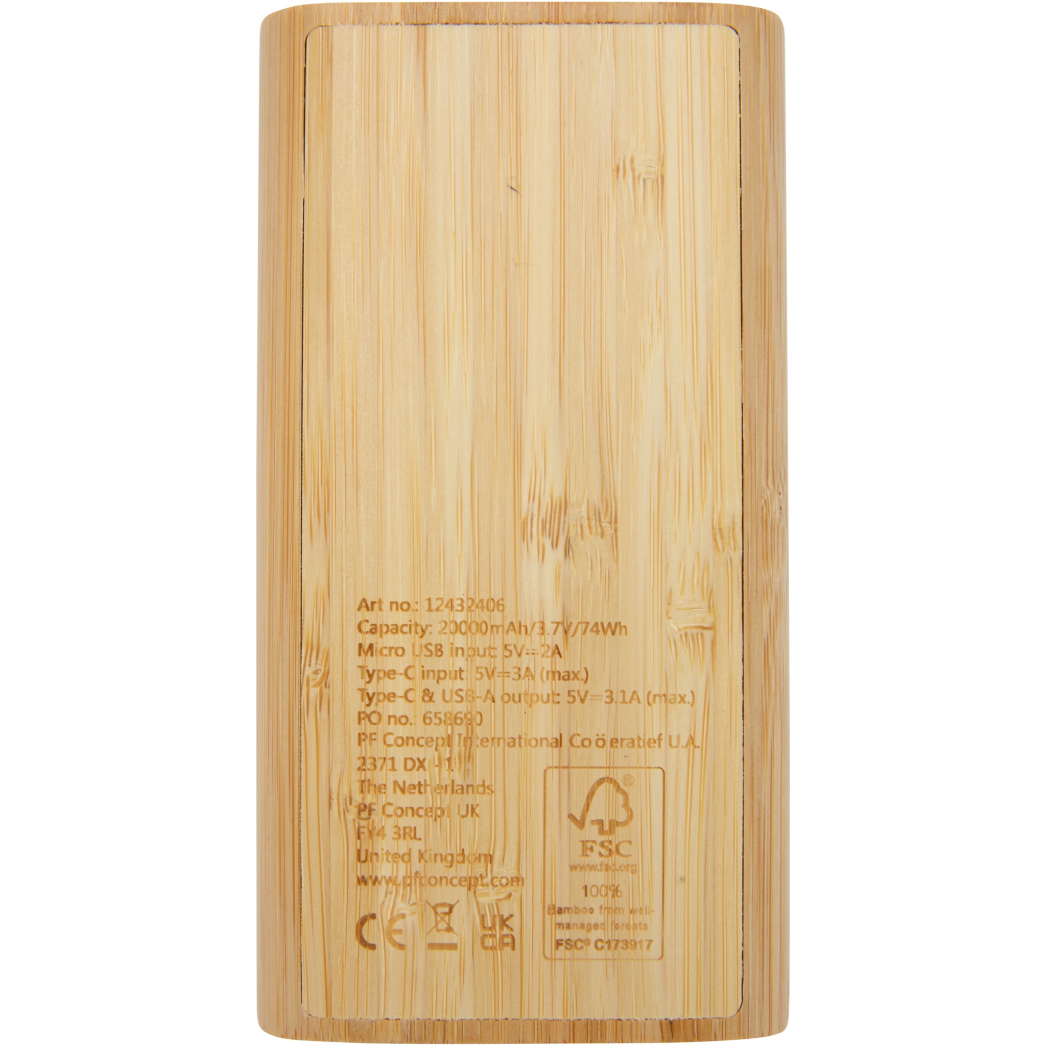 20 000 mAh barošanas bloks, kas izgatavots no bambusa ar ON/OFF skārienpogu un 4 LED indikatoriem, kas parāda atlikušo akumulatora jaudu. Micro USB ieeja 5V/2A, C tipa ieeja 5V/3A, C tipa izeja 5V/3.1A max, dubultā USB-A izeja 5V/3.1A max, kopējā jauda 15.5W. Tiek piegādāts ar 30 cm TPE 3A Type-C uz Type-C uzlādes kabeli, lietošanas instrukciju un kraftpapīra dāvanu kastīti. Tā kā bambuss ir dabisks izstrādājums, katrai vienībai var būt nelielas krāsas un izmēra atšķirības, kas var ietekmēt galīgo drukas rezultātu.
