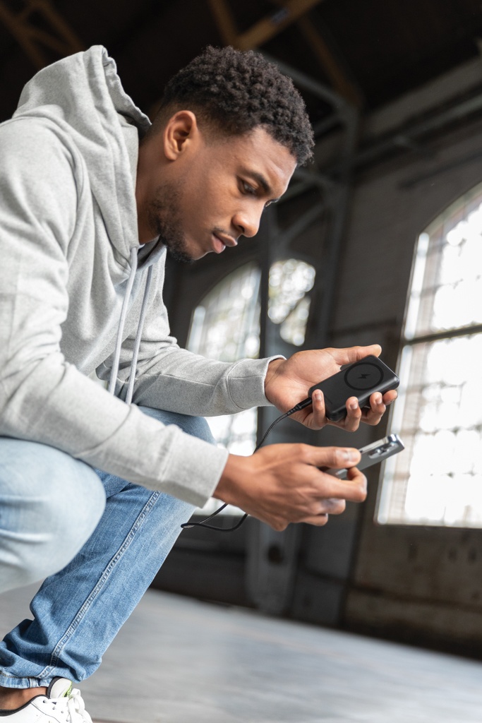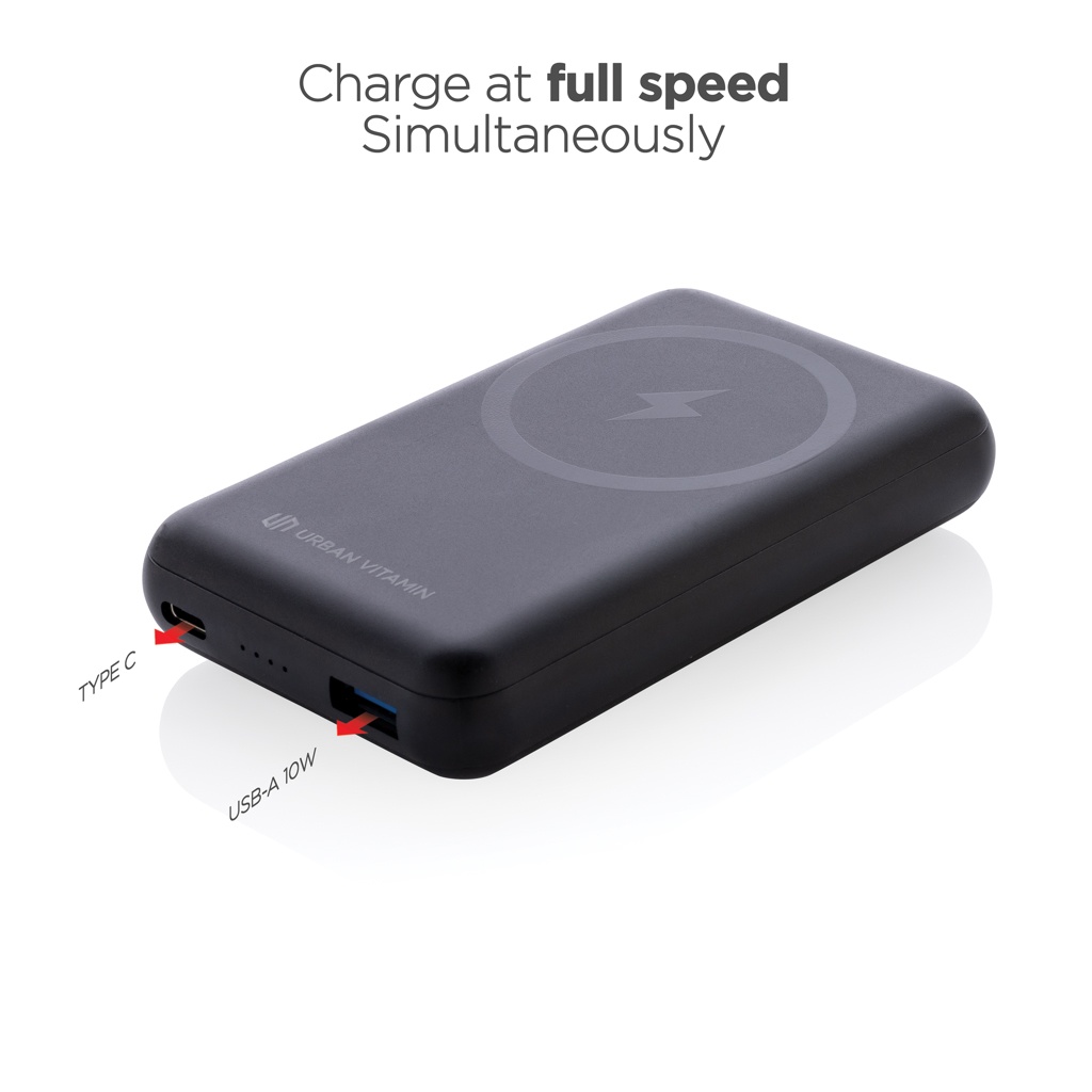 Uzlādējiet tālruni līdz 2,5 reizēm, izmantojot šo ātrās uzlādes barošanas bloku. Plānajai un kompaktajai barošanas bankai ir integrēts ātrs 10 W bezvadu magnētiskais lādētājs. Tam ir daudzpusīgs iebūvēts salokāms statīvs, kas notur tālruni vertikāli, nodrošinot ērtu skatīšanās leņķi. Pateicoties īpaši ātrajam C tipa PD portam, jaudas banka tiek uzlādēta rekordīsā laikā. Tālruņa uzlāde līdz 50% aizņem tikai 30 minūtes. Lēna uzlāde ir kaut kas no pagātnes. Powerbank satur ilgstošu A klases 10 000 mah akumulatoru, lai uzlādētu visas jūsu ierīces ceļojumos un piedzīvojumos. Dubultās izejas A un C tipa ports ļauj vienlaikus uzlādēt līdz 2 ierīcēm. Izgatavots no RCS (Recycled Claim Standard) sertificēta pārstrādāta ABS Kopējais pārstrādātais saturs: 16 %, pamatojoties uz izstrādājuma kopējo svaru. RCS sertifikācija nodrošina pilnībā sertificētu pārstrādāto materiālu piegādes ķēdi. Urban Vitamin preces ir izgatavotas bez PVC un iepakotas samazinātā plastmasas iepakojumā. USB: 5V 3.0A C tips: 5V 3.0A, 9V 2.22A, 12V 1.5A.