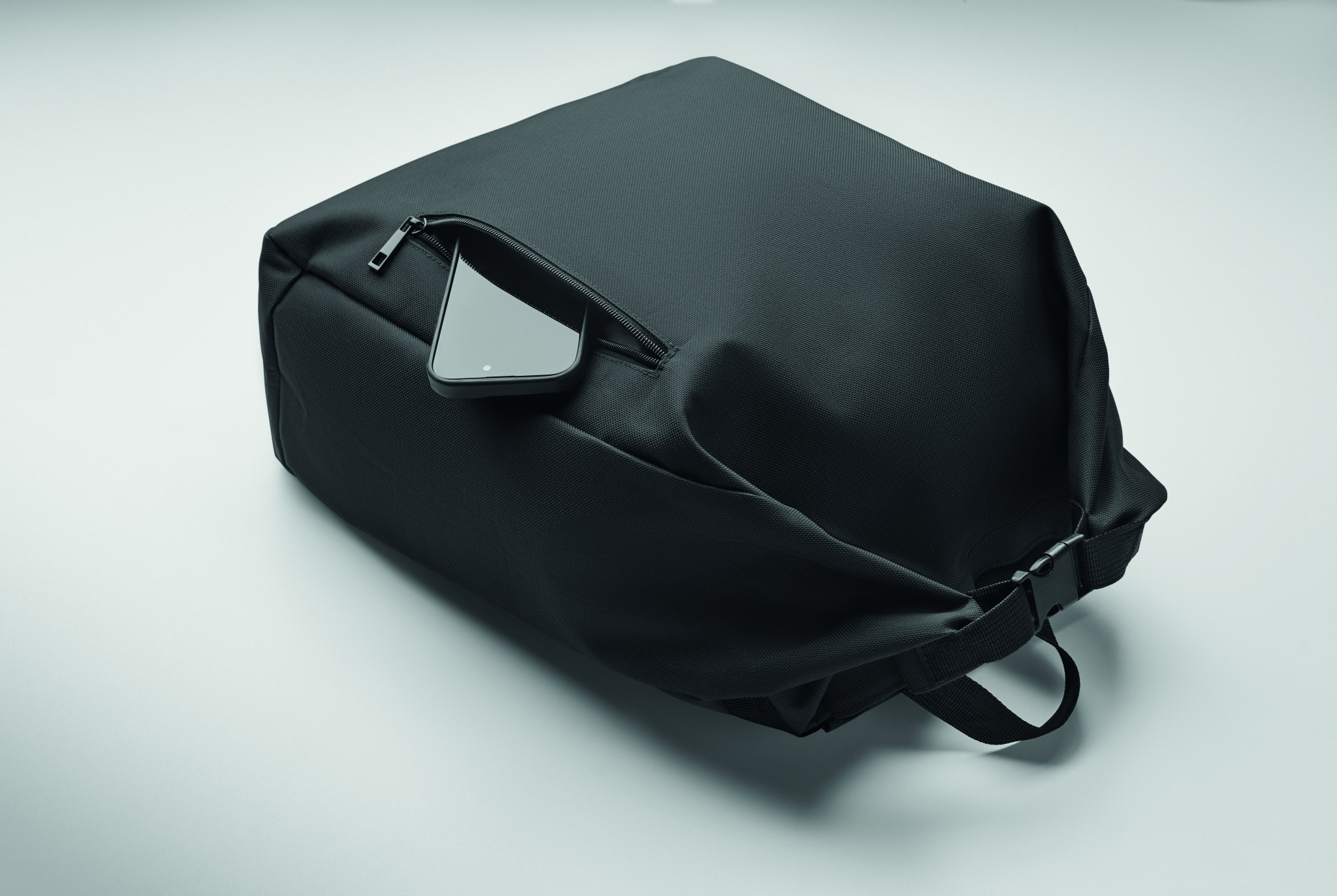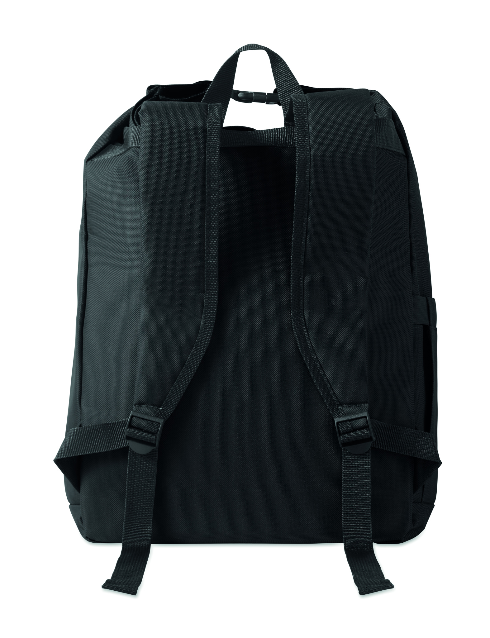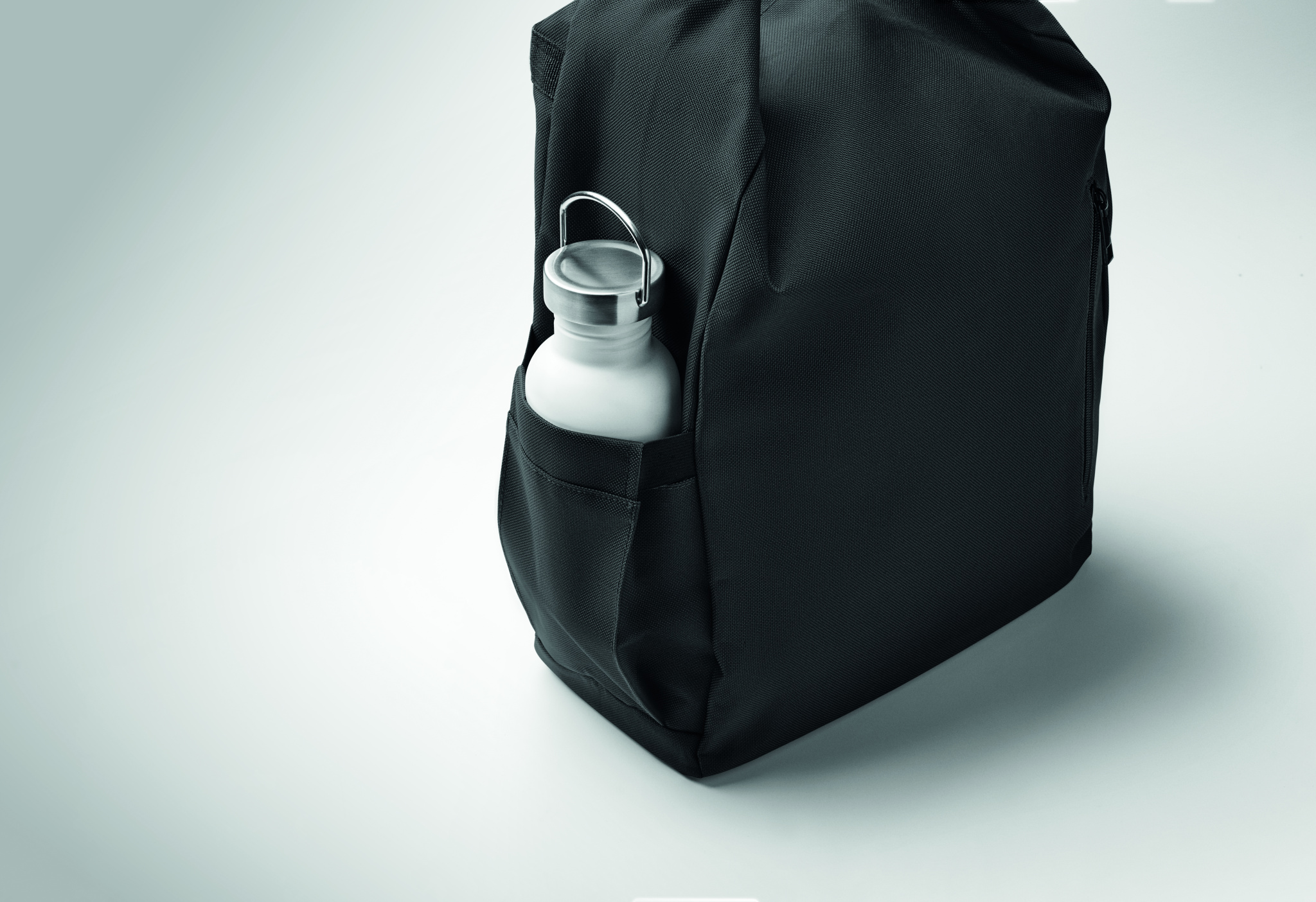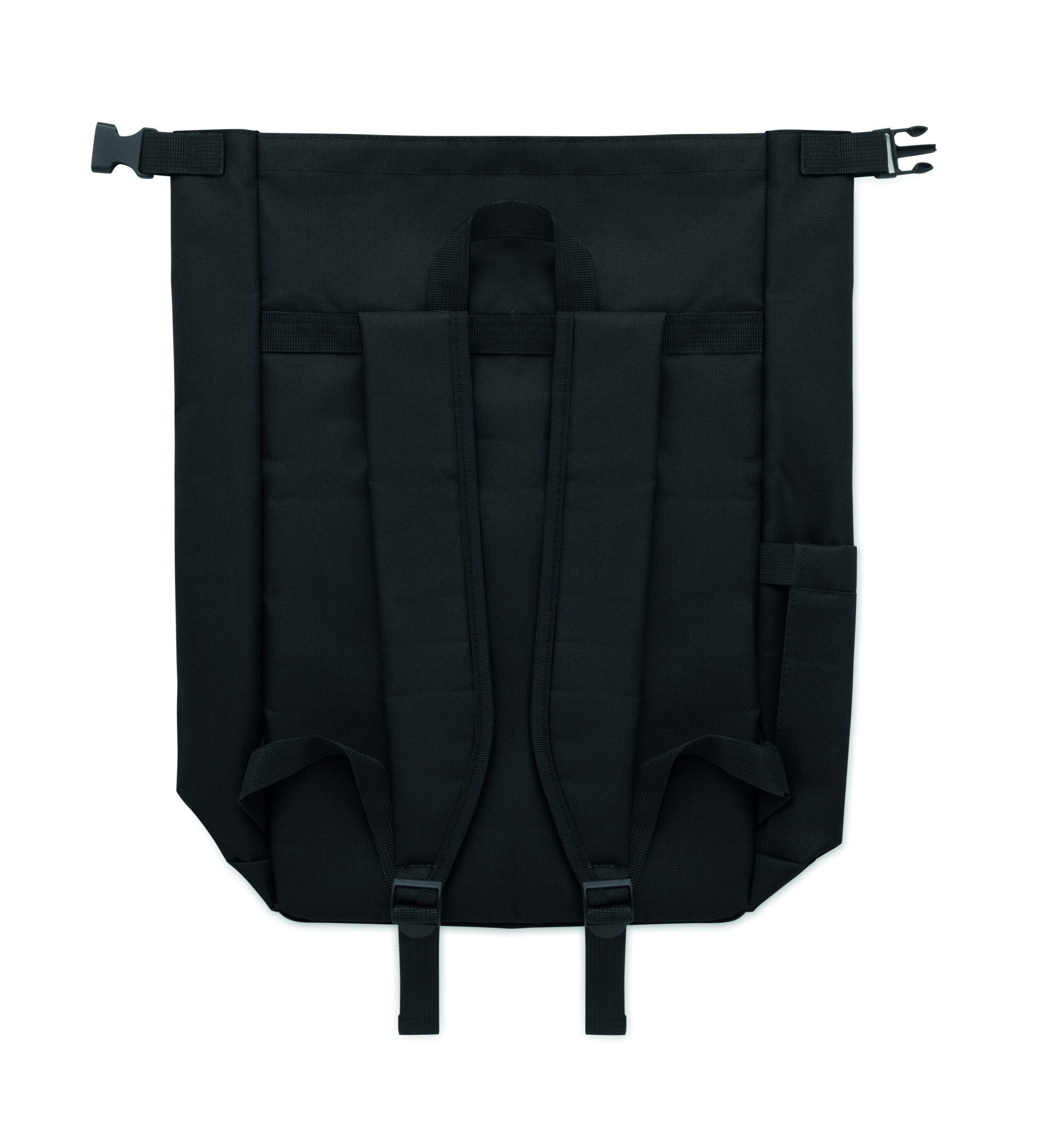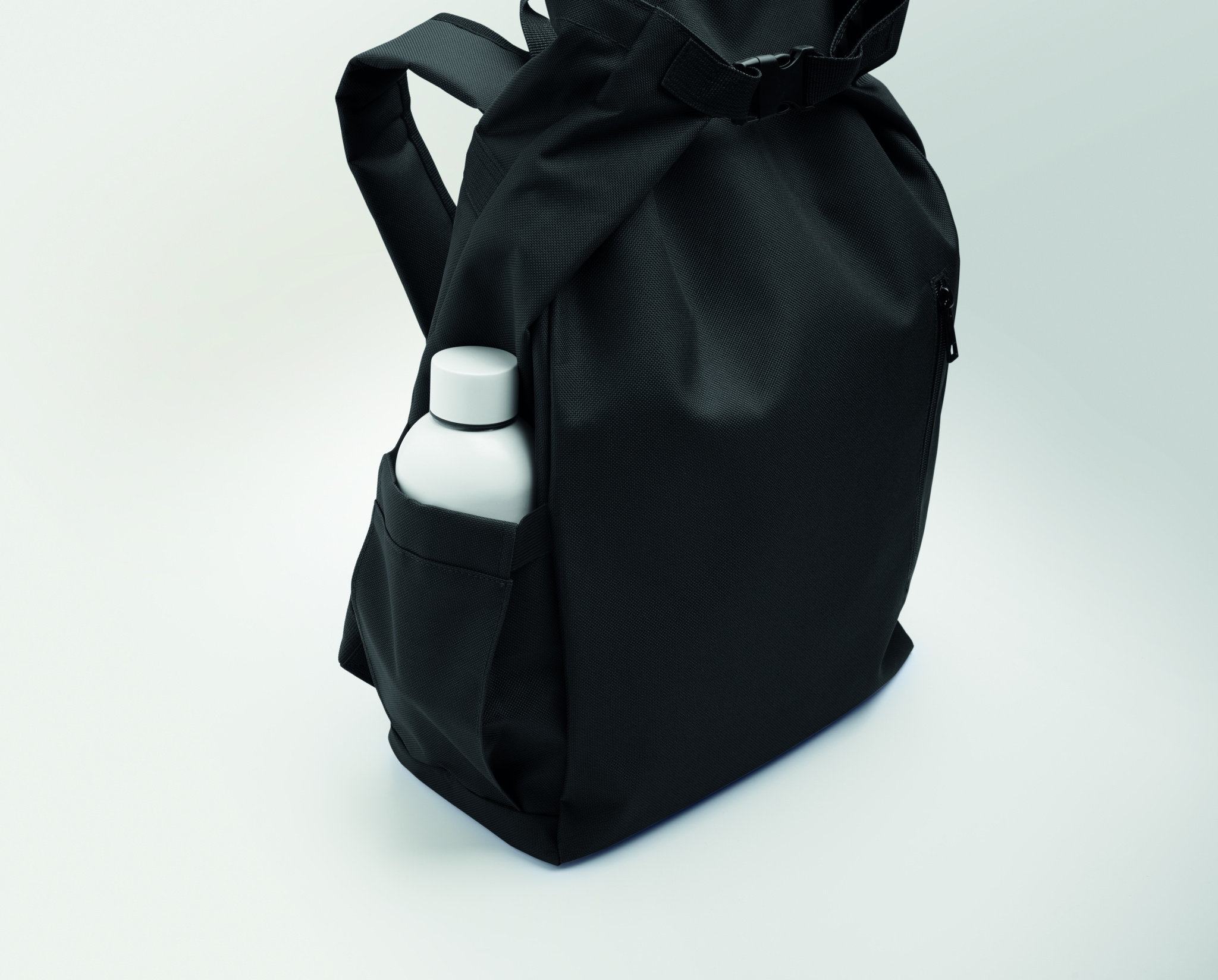 15-inch roll top laptop backpack made of 600D RPET polyester with 210D RPET padded lining. Features a zippered front pocket, elastic side pocket, and adjustable shoulder straps.