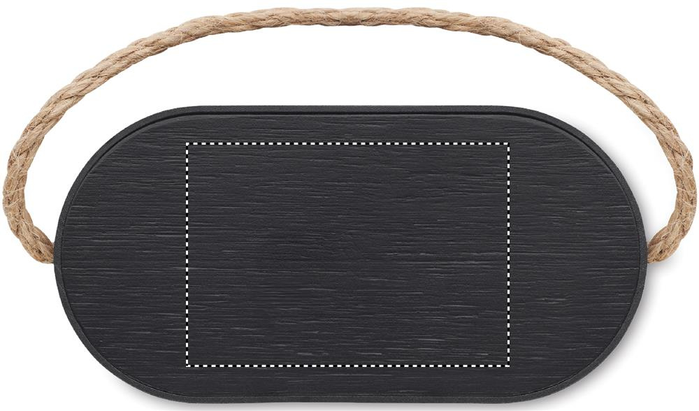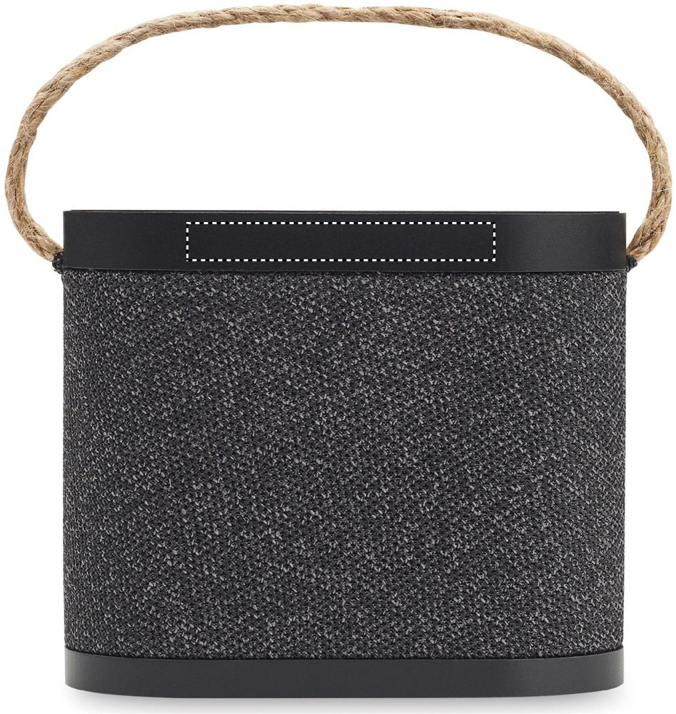5.3 wireless speaker in ABS with RPET polyester fabric finish and bamboo 15W wireless charger top, with jute handle. 1 Rechargeable Li-Ion 1200 mAh battery. Output data: 5W, 4 Ohm and 5V. Playing time approx. 4h.