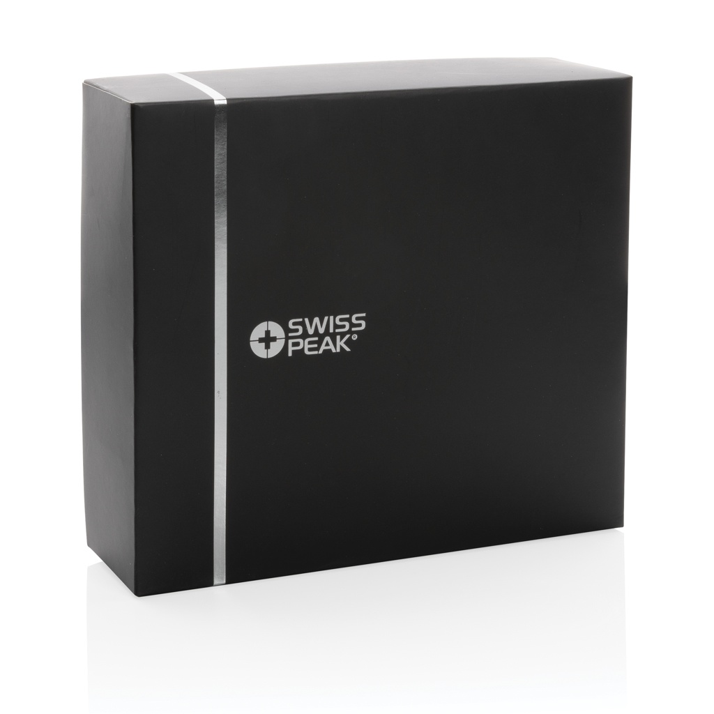 Беспроводные стереонаушники с высококачественным звуком для идеального звучания. Аккумулятор емкостью 300 мАч позволяет слушать музыку до 11 часов на одной зарядке, а подзарядка занимает всего 1,5 часа. Рабочее расстояние до 10 метров. Наушники можно сложить, чтобы они поместились в дорожный чехол Swiss Peak EVA, который входит в комплект. Благодаря алюминиевому корпусу и воздушным подушкам из полиуретана наушники достаточно удобны для ношения в течение нескольких часов. С микрофоном для приема звонков. Включая кабель AUX.