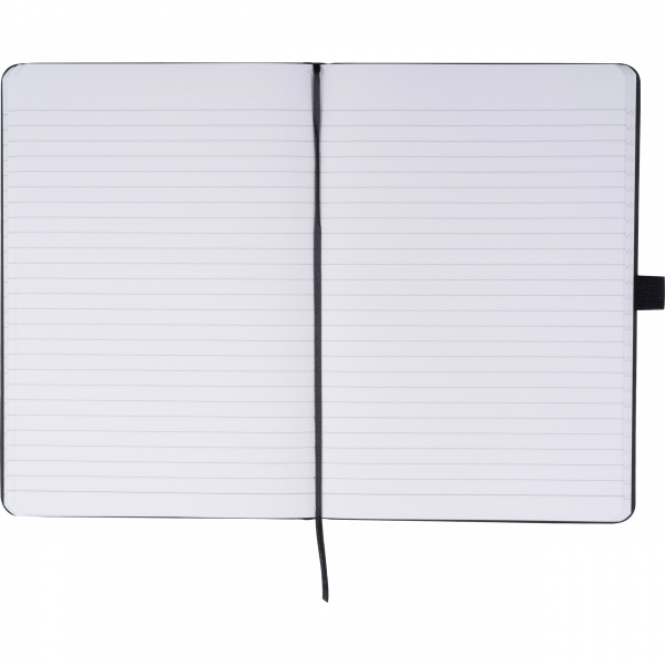 Блокнот формата А5 с полиуретановой обложкой, закладкой, эластичной застёжкой, держателем для ручки и 120 линованными страницами из каменной бумаги. Эта специальная бумага изготовлена из карбоната кальция, обладает масло- и водоотталкивающими свойствами, антистатична, не зерниста, огнестойка и, что самое главное, устойчива к разрывам. Ваш логотип напечатан на внешней стороне обложки.