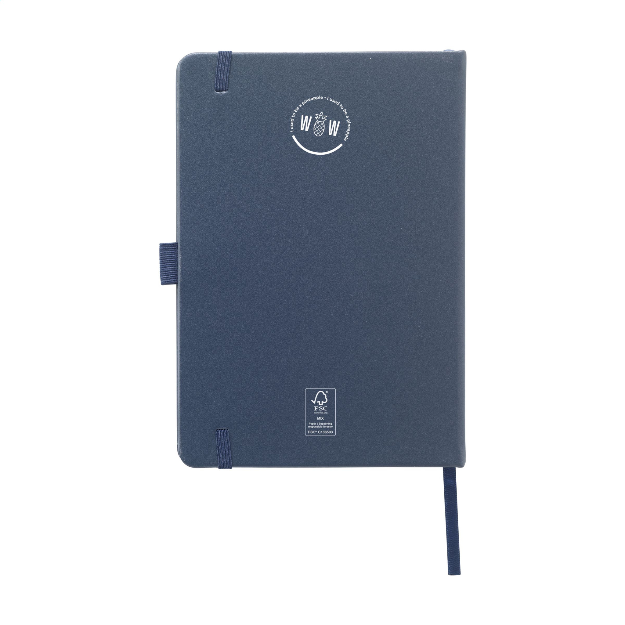 WoW! Блокнот формата A5 с твердой обложкой из искусственной кожи ананаса. Этот материал изготовлен из 30% переработанных компонентов ананаса. Этот блокнот имеет около 80 листов/160 страниц белой линованной бумаги, сертифицированной FSC Mix (80 г/м²), и оснащен эластичной застежкой, переплетенным корешком, петлей для ручки и лентой для чтения. Веганская искусственная кожа практически неотличима от настоящей кожи. Однако материал изготовлен из листьев ананаса, остаточного продукта выращивания ананаса. По этой причине для его производства не требуются дополнительные вещества, такие как вода, удобрения или пестициды. Волокна листьев ананаса промываются, обогащаются ПУ и высушиваются в духовке. Результат? Мягкие листы веганской искусственной кожи, которые затем снабжаются красивой отделкой. После сушки создается мягкий и привлекательный материал со свойствами кожи. Он состоит частично из остатков фруктов и частично из ПУ.