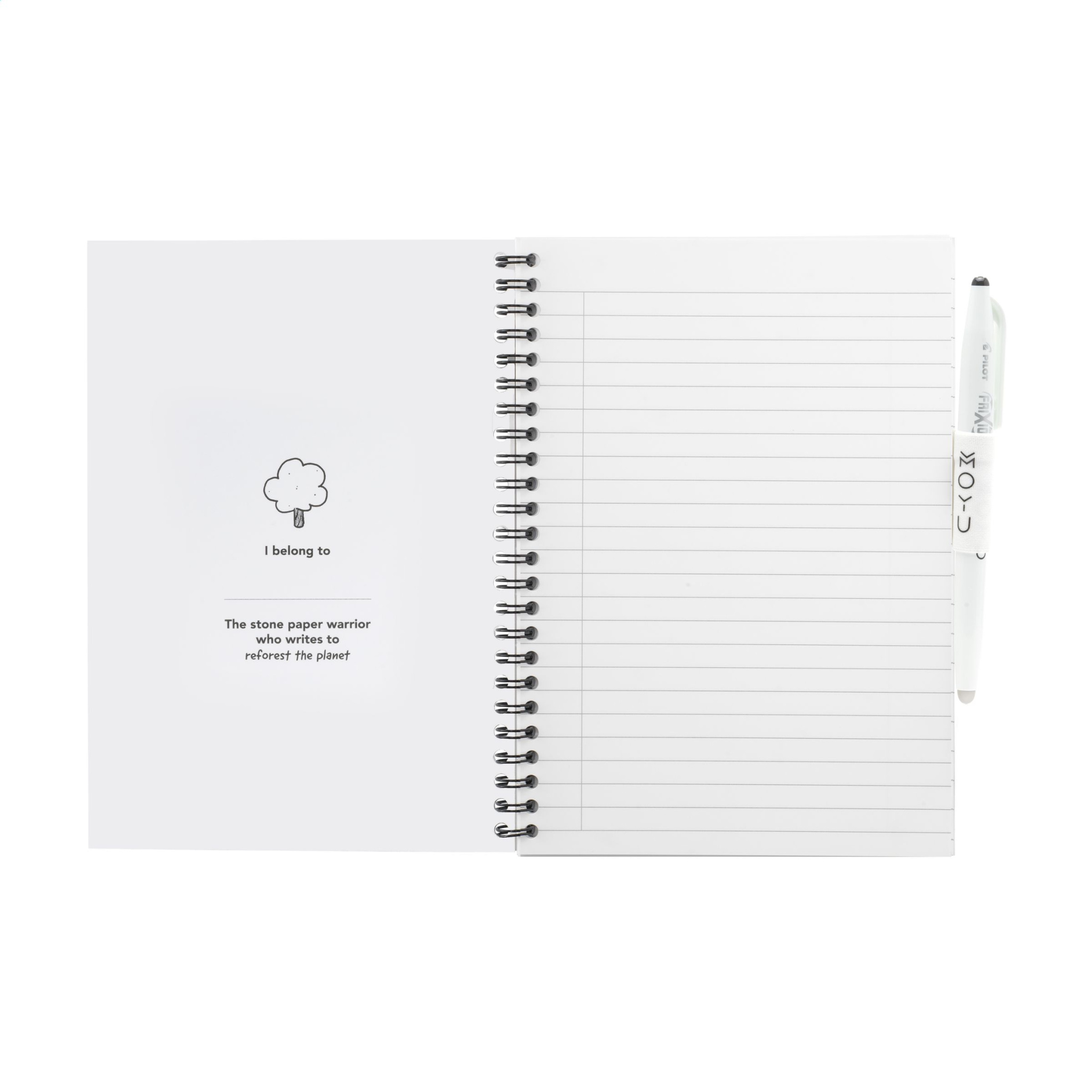 Стираемый блокнот формата A5 под брендом MOYU из каменной бумаги. С мягкой обложкой весом 400 грамм. В комплект входят ручка и салфетка для протирки. Каждая страница каменной бумаги производится экологически чистым способом, не содержит деревьев и на 100% пригодна для вторичной переработки. Этот блокнот с эластичной петлей для ручки имеет прочный переплет wire-o и содержит 18 страниц линованной бумаги, чистую бумагу. Делайте заметки с помощью прилагаемой специальной ручки MOYU. Эта ручка содержит оригинальные чернила Frixion. Эти специальные чернила полностью высыхают на каменной бумаге и легко стираются, не оставляя следов. Слегка смочите прилагаемую салфетку MOYU водой и сотрите чернила. Таким образом, страницы останутся пустыми для новых идей и списков дел. В среднем вы можете писать на каменной бумаге 500 раз. Этот блокнот прослужит вам долгие годы. При заказе 50 штук и более вы можете выбрать обложку с вашим собственным полноцветным дизайном. Каменная бумага изготовлена из 80% известняка и 20% чистого пластика. Она естественным образом не содержит деревьев, и для ее изготовления не требуется ни воды, ни химикатов. Производство каменной бумаги, таким образом, более экономично и производит на 67% меньше CO2, чем при производстве целлюлозной бумаги. Кроме того, каменную бумагу можно перерабатывать бесконечно, без необходимости добавления нового сырья.